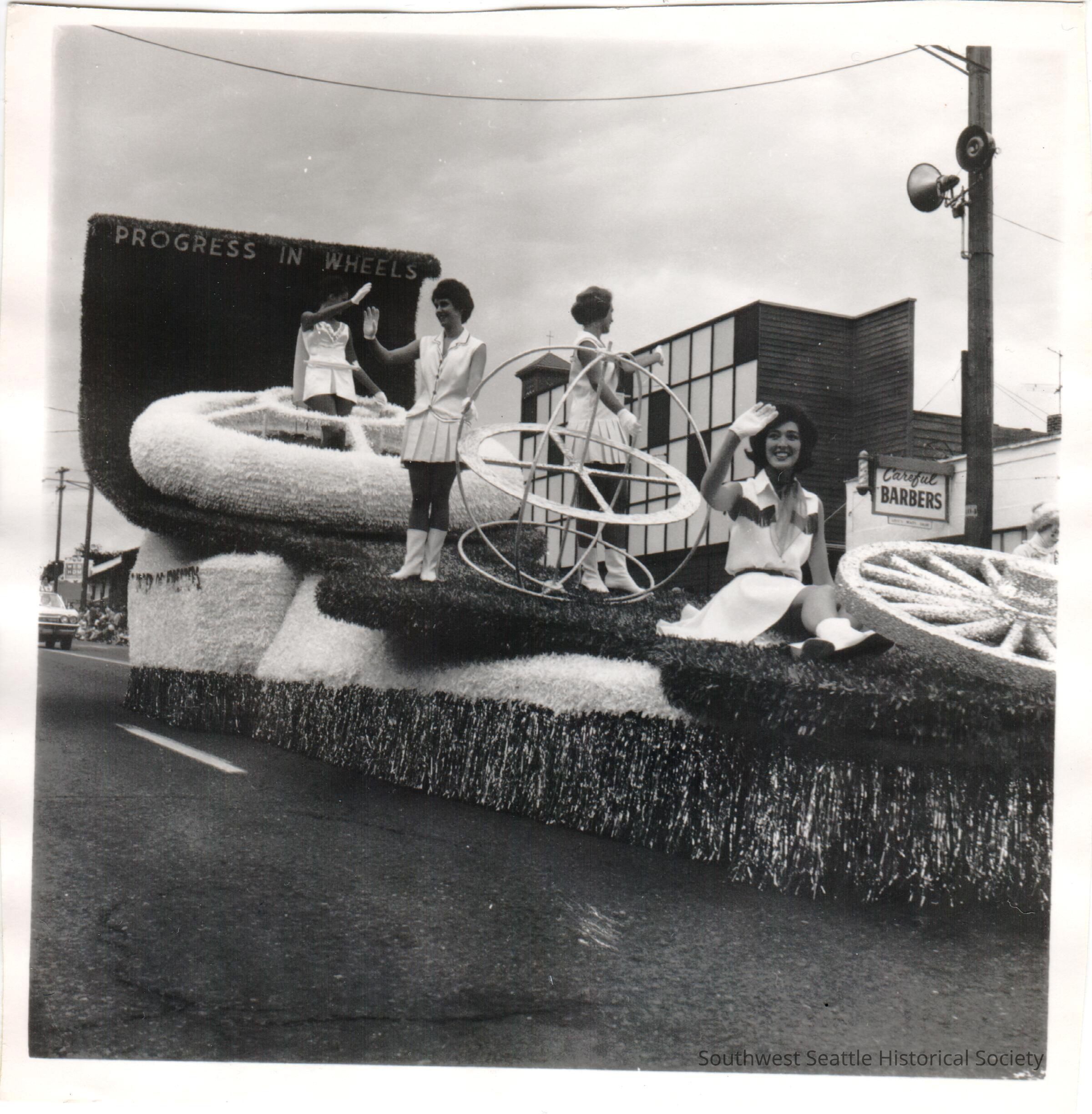 Hi-Yu / 1966 Parade showing "Progress in Wheels" float. 4 women standing on float standing amongst the wheels.