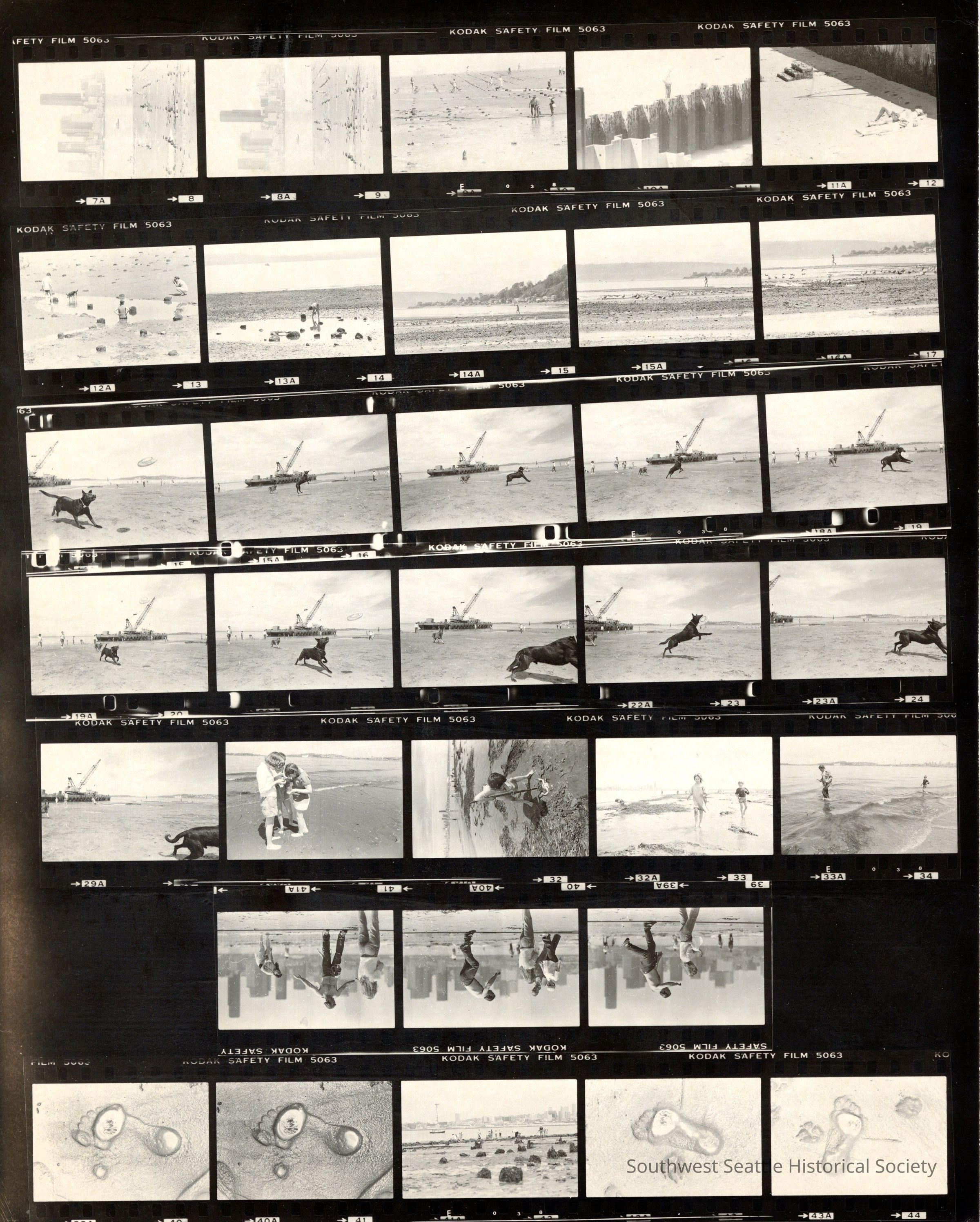 Three contact sheets showing images of West Seattle beaches at low tide, including beaches at Alki and Harbor Avenue. Also see 2003.20.981 and 2003.20.982
