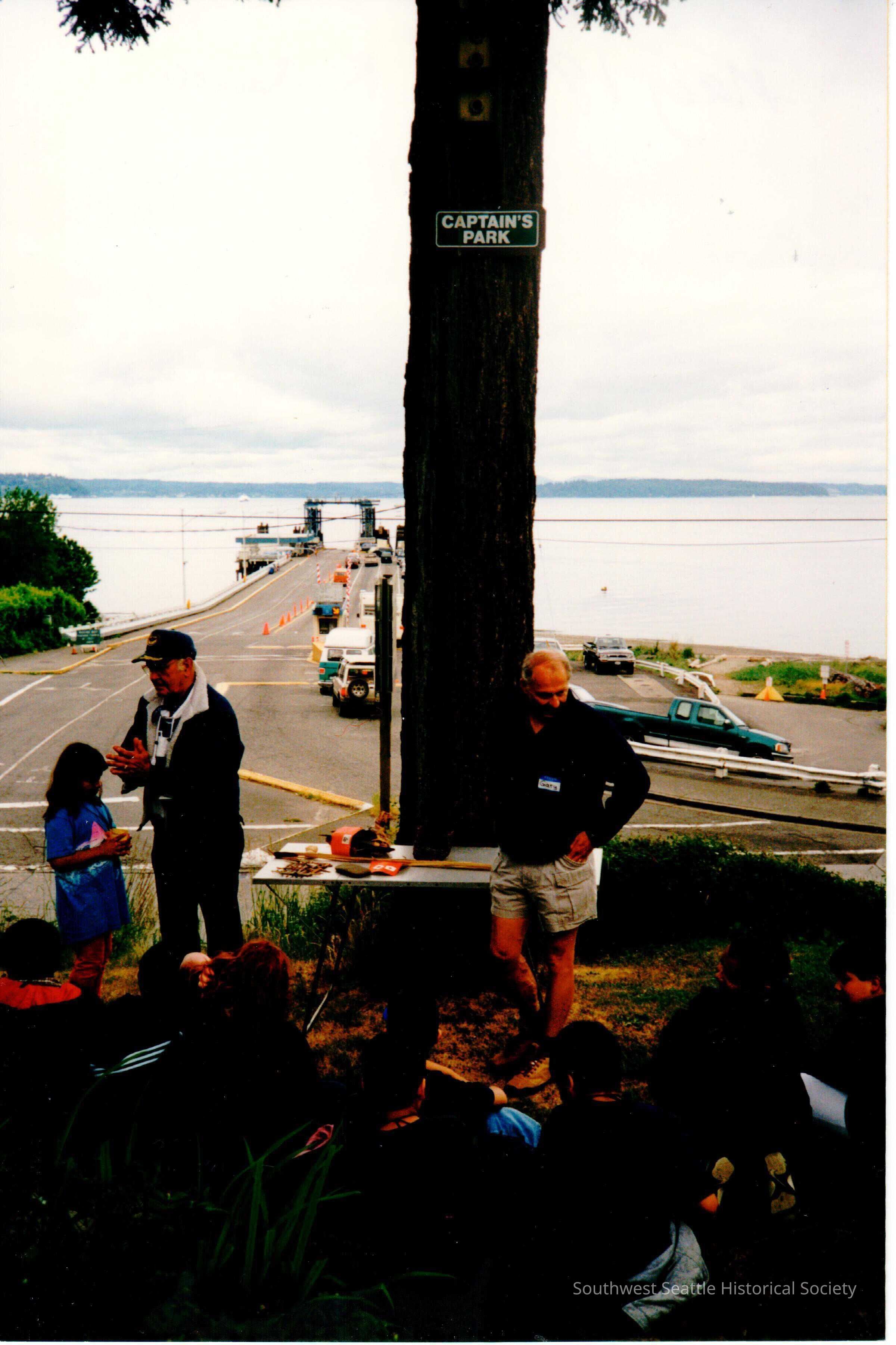 Volunteers Morey Skaret (left) and Gary Dawson talk about Native American camping with students from Kimball Elementary on a field trip to Fauntleroy Creek