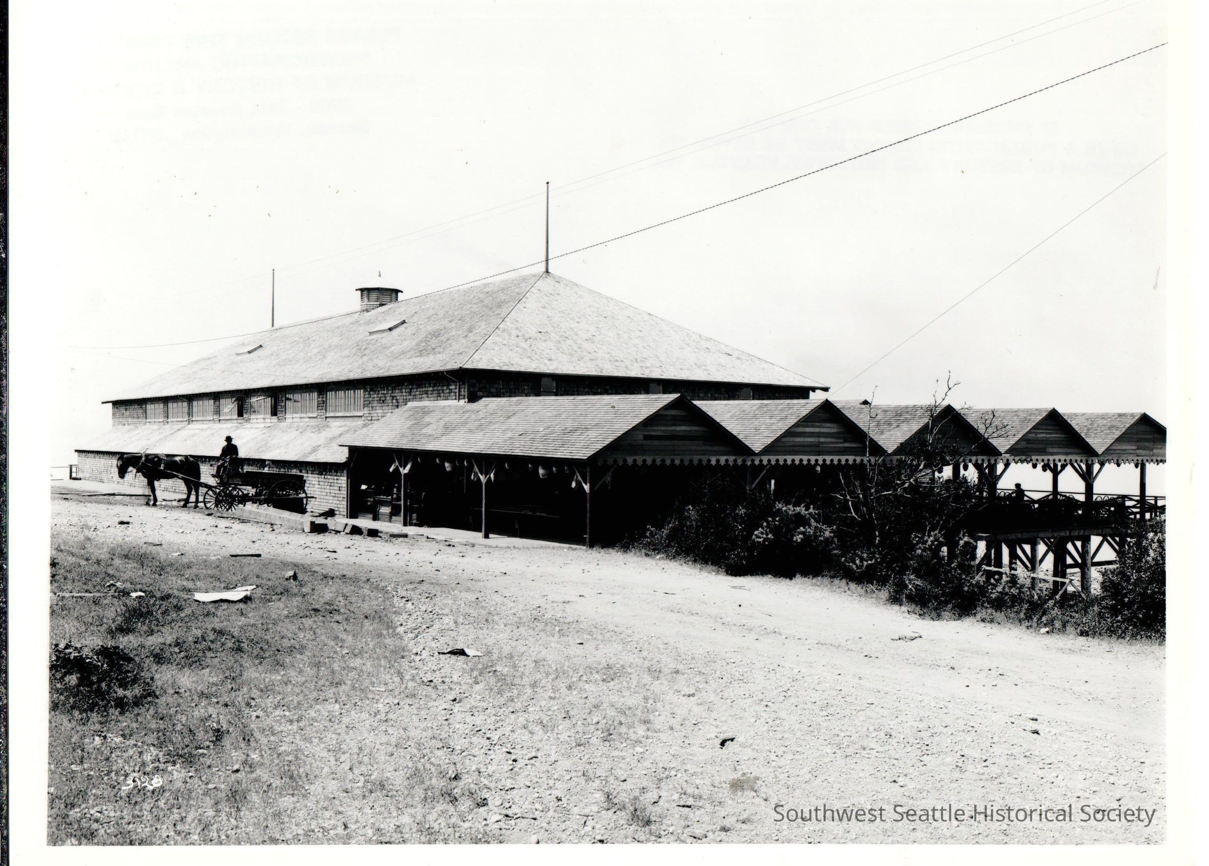 Black and White photo of Alki Natatorium. A horse and cart is in front of the building with a person sitting on the cart