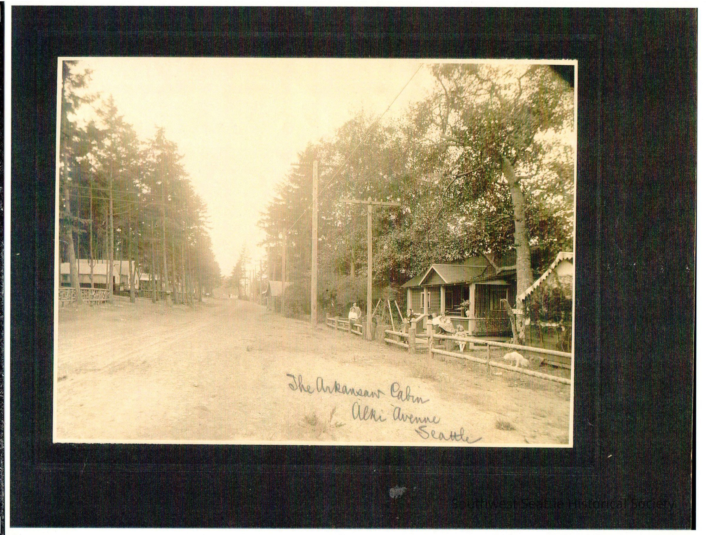 A wide view of the Arkansaw Cabin on Alki Avenue. The view is looking down the street with the cabin to frame right. There are several other buildings lining the street. Two adults and five children are sitting on the fence and in the yard of the cabin.