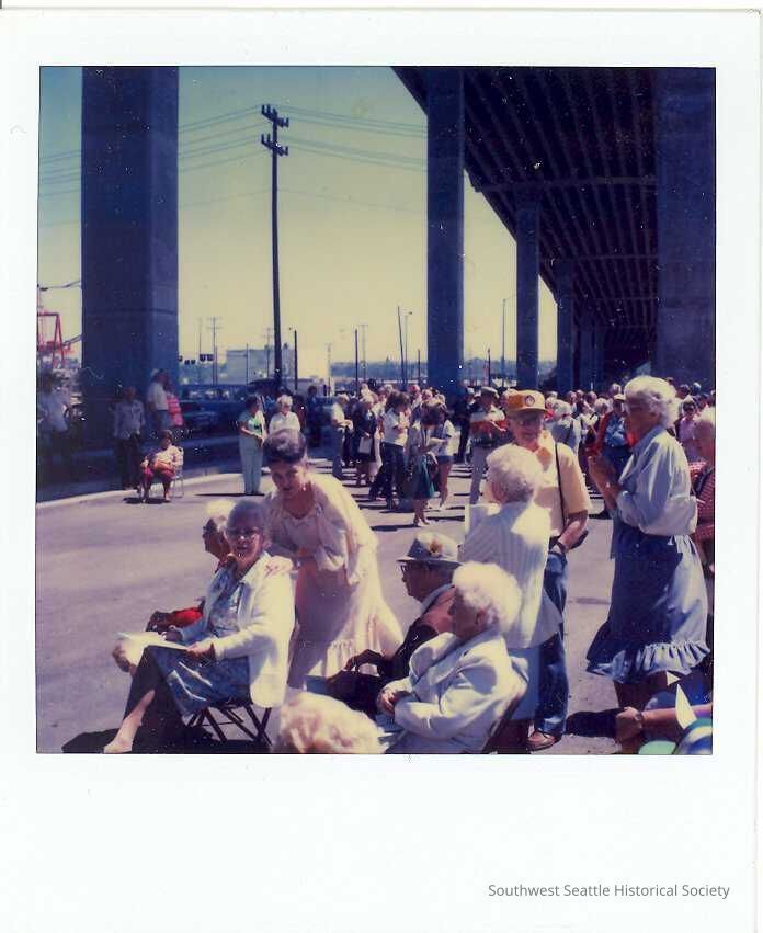 polaroid photo of people sitting in folding chairs under the West Seattle Bridge