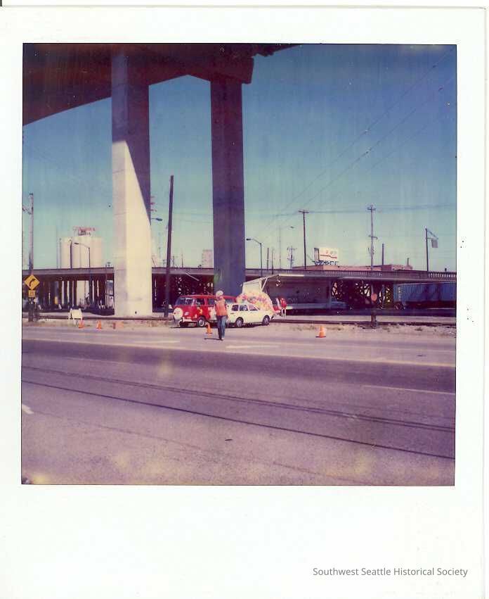 polaroid photo - woman standing under West Seattle bridge, marking the road off with safety cones