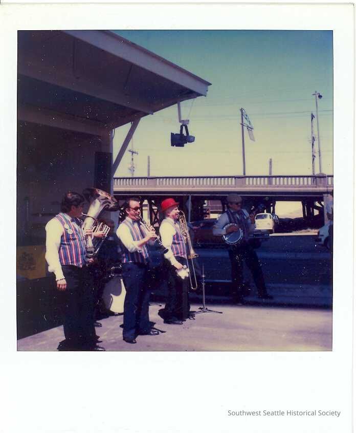 Polaroid photo - brass band playing at the West Seattle bridge dedication on July, 14 1984