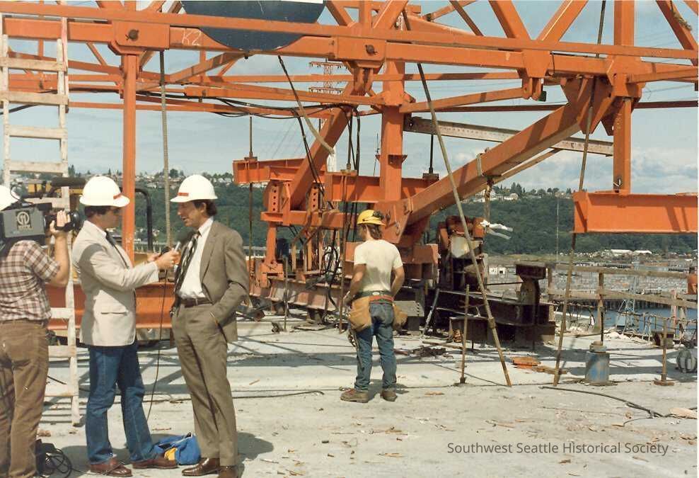 color photo - constuction of the West Seattle bridge - man getting interviewd