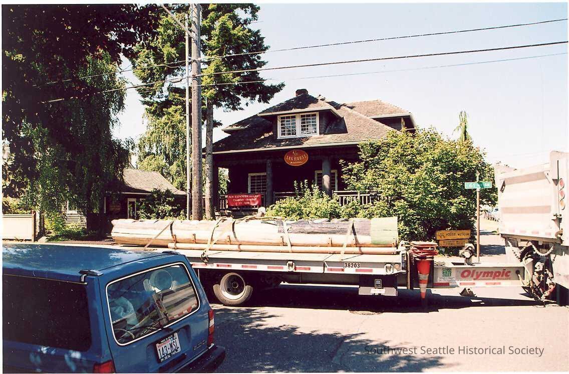 color photo - Admiral Way totem being transported to the Log House Museum