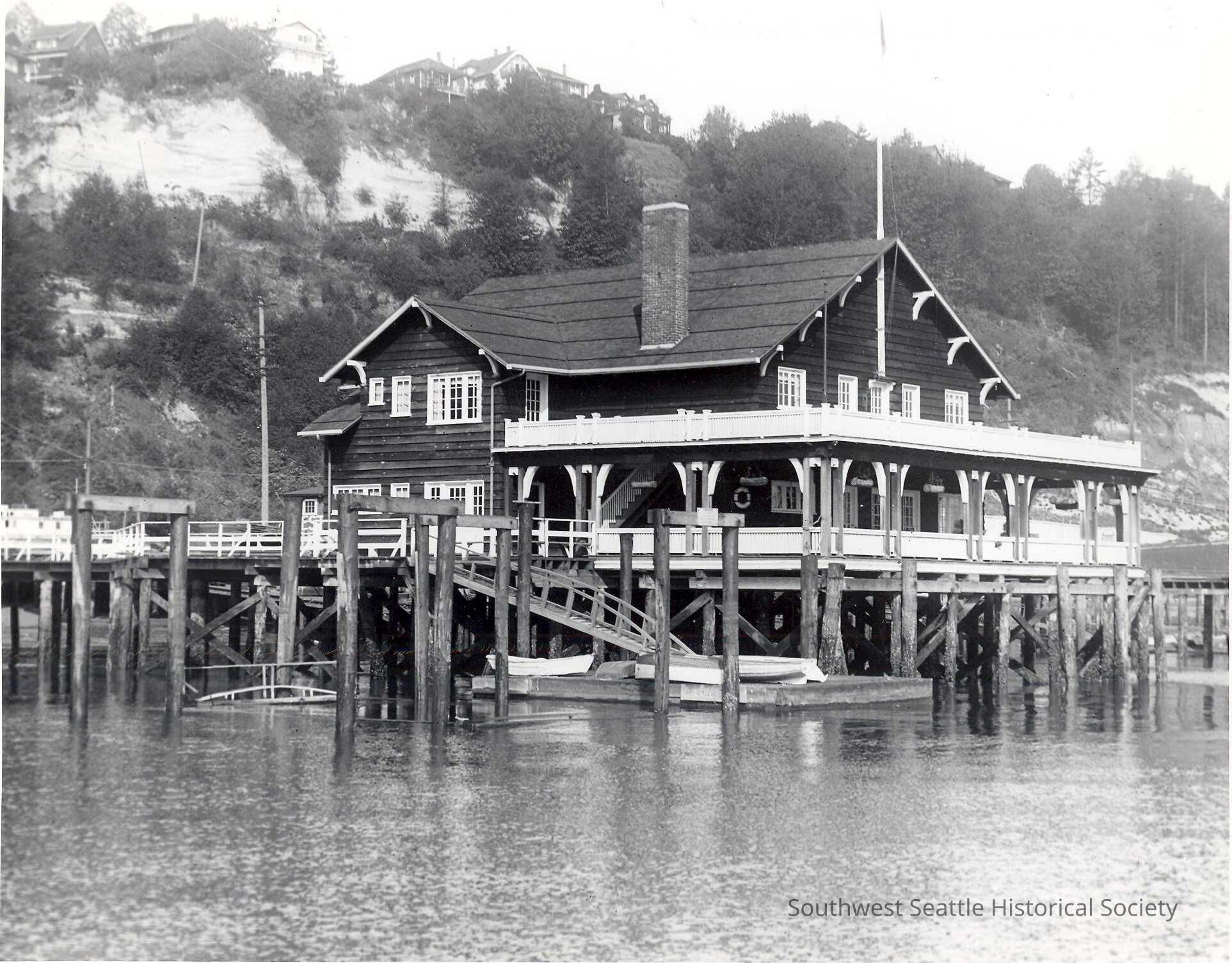 BW photo of the West Seattle Yacht Club building back marked: "CA 1910 - Seattle Yacht Club, West Seattle"