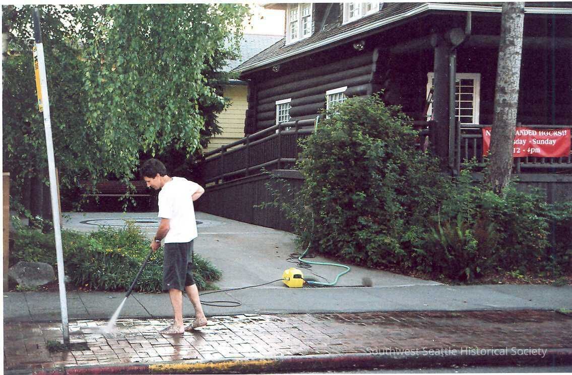 color photo man powerwashing heritage bricks in the sidewalk on Stevens St, near the bus stop.