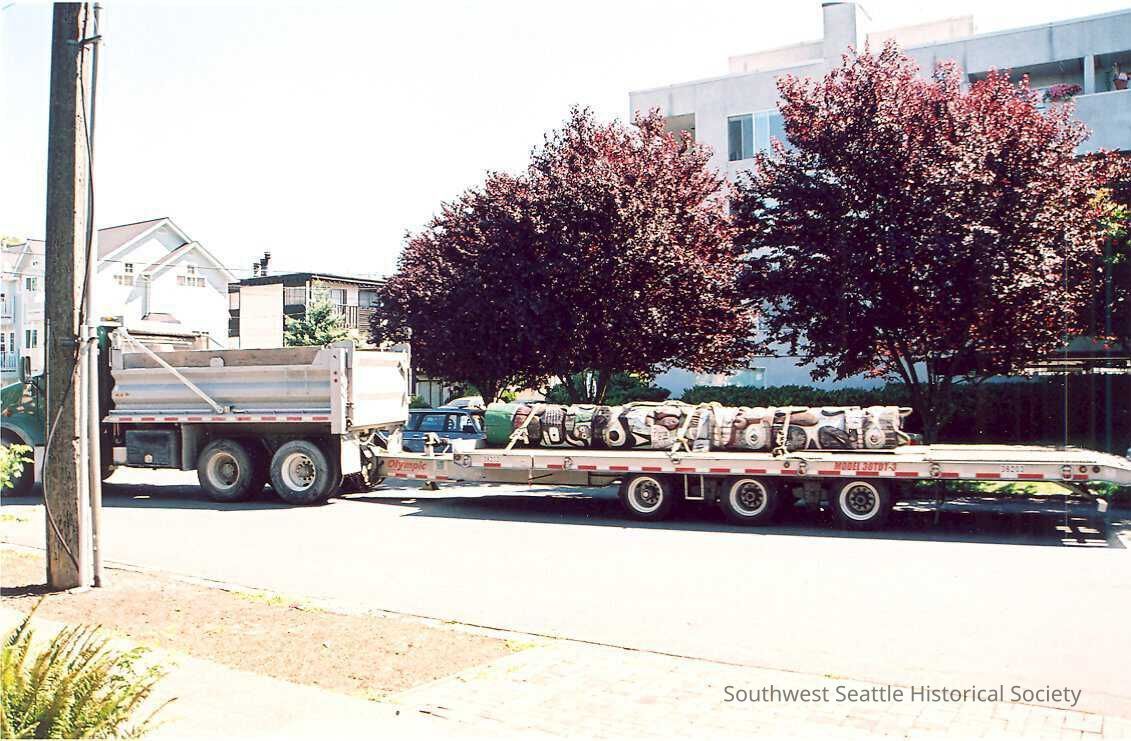 color photo Admiral Way totem pole being moved to the Log House Museum truck hauling pole parked on Stevens St