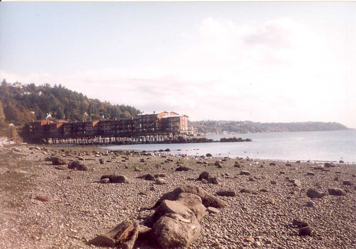 color photo - Beach Drive Controversial apartment building built on pier, over Puget Sound. Taken at low tide written on back "Compare with Rose Lodge postcard Oct '99 24"