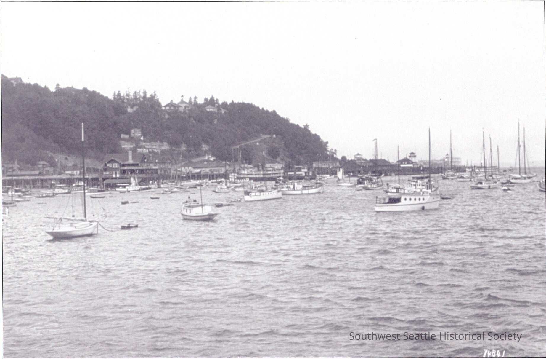 BW photo of boats in Puget Sound, off Harbor Avenue. West Seattle Yacht Club in background written on back of photos "Ashael Curtis 1910"