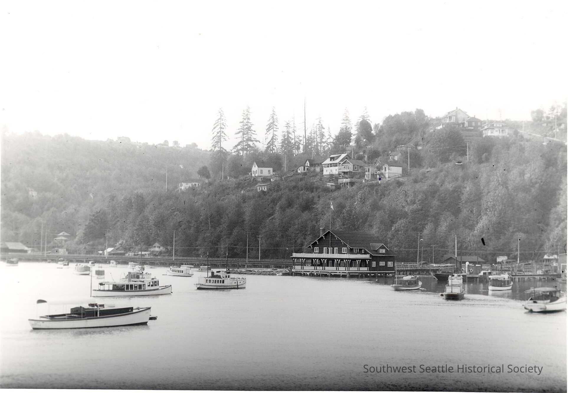 BW photo of the West Seattle Yacht Club and boats in Puget Sound