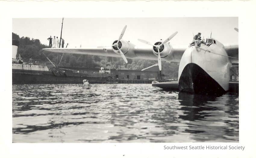 Alki and Transportation Boeing 314 Clipper doing tests off Alki - George Shively worked on six of these in 1940 or 1941 See FIC1997.37.219b-g