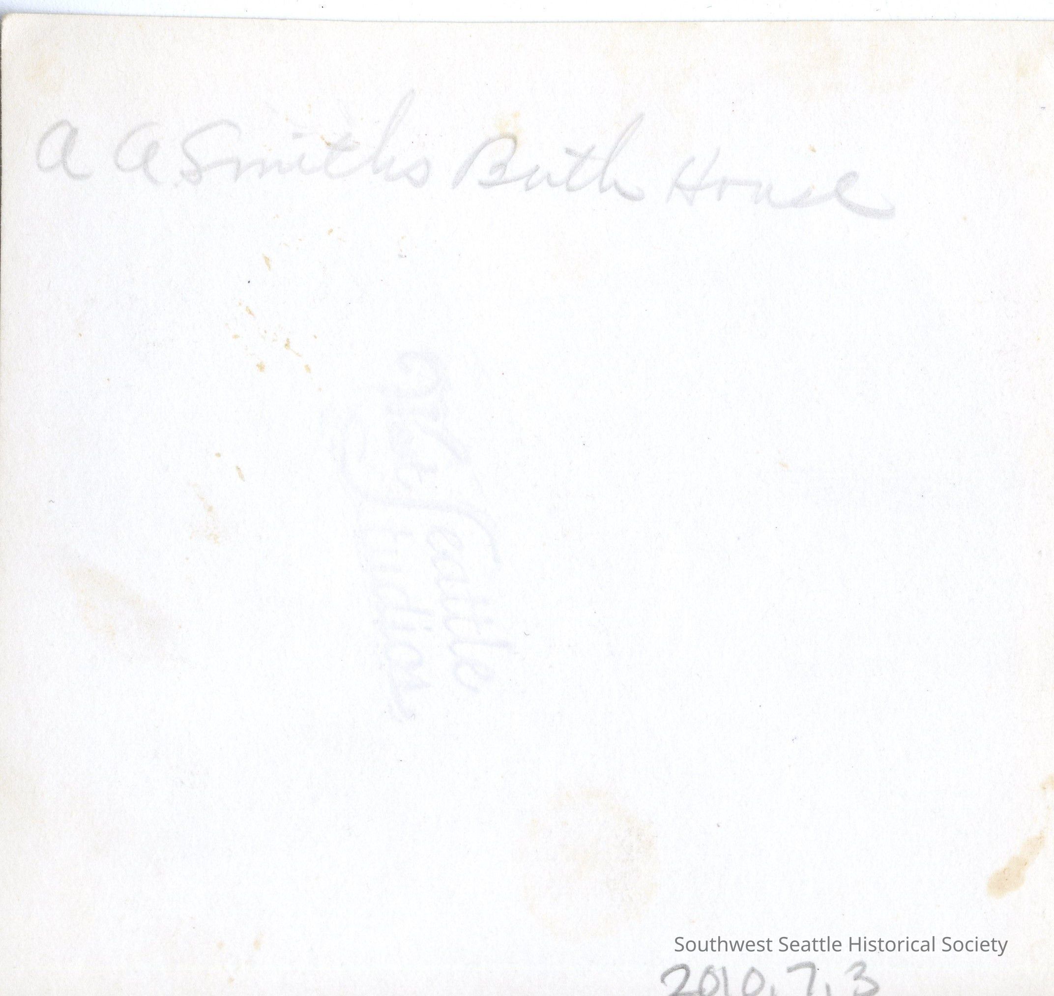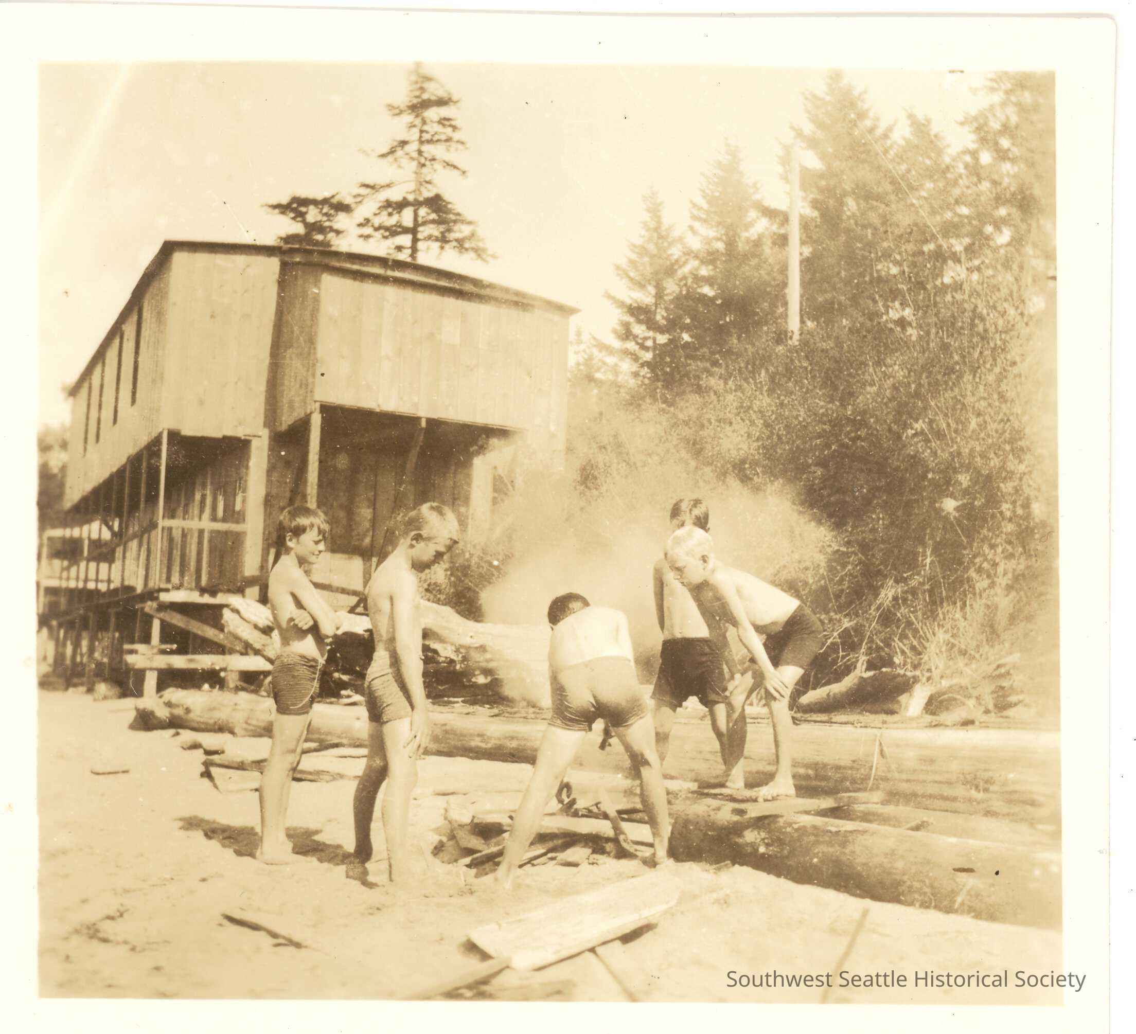 Sephia photo of 5 boys playing on logs on Alki Beach in front of the A.A. Smith Bathhouse handwritten on back "AA Smith's bath house"