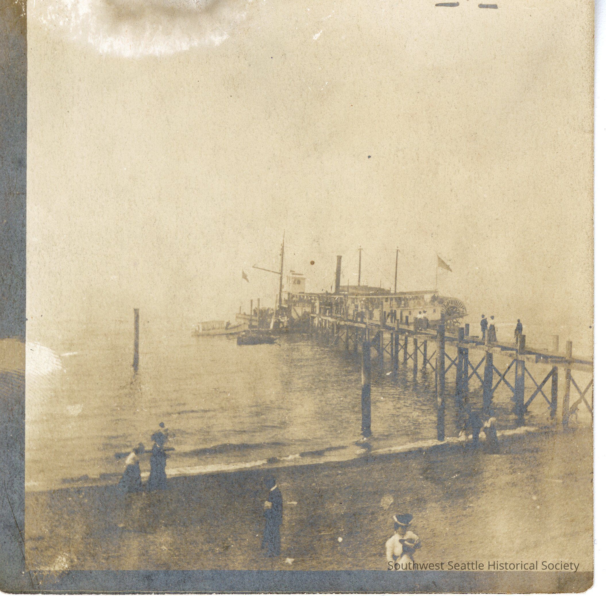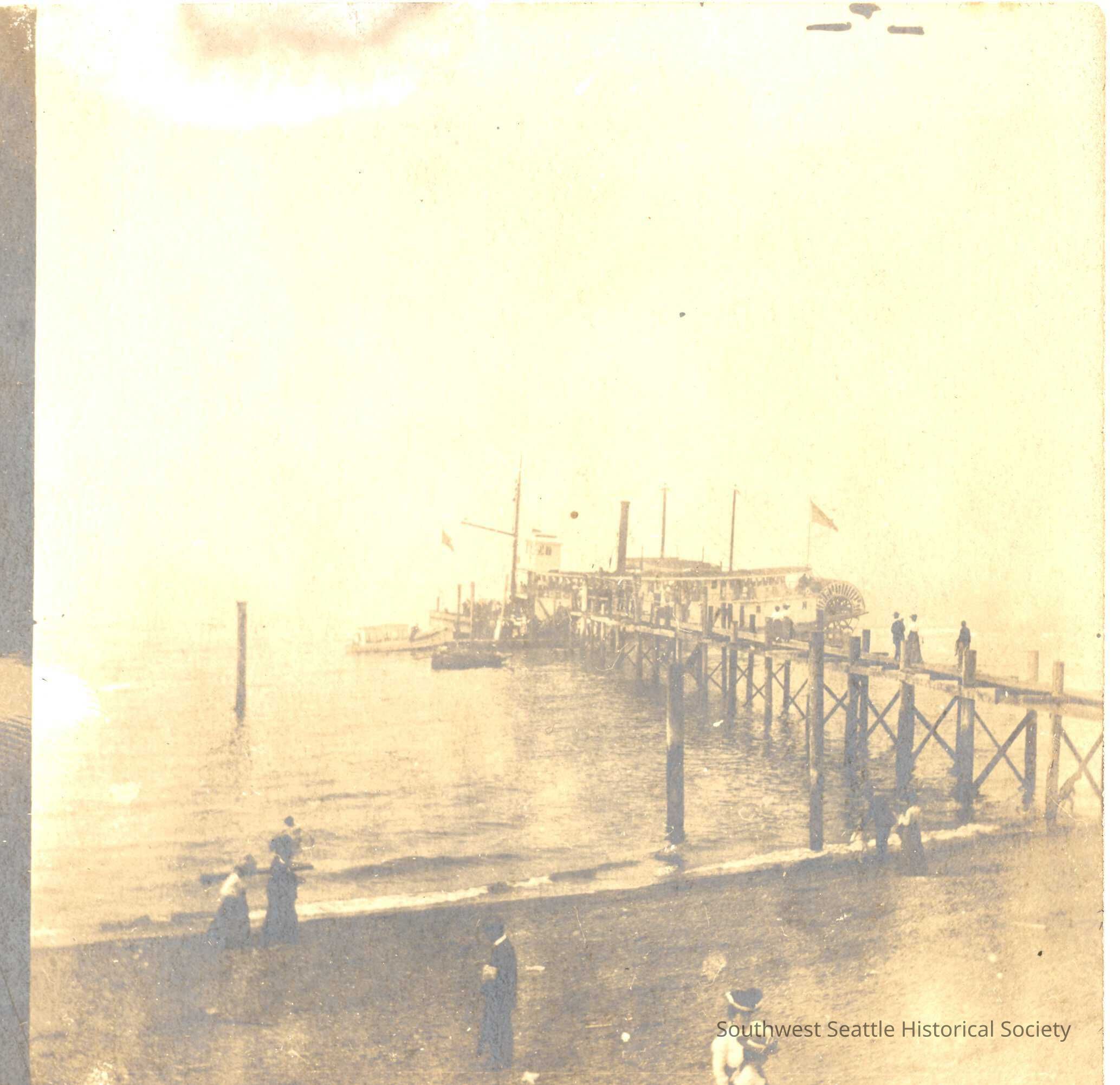 Sephia photo of ferry dock on Alki. Women in foreground in Victorian dress Handwritten on back of photo "Bonaire Station at Alki Point? B Bowman"
