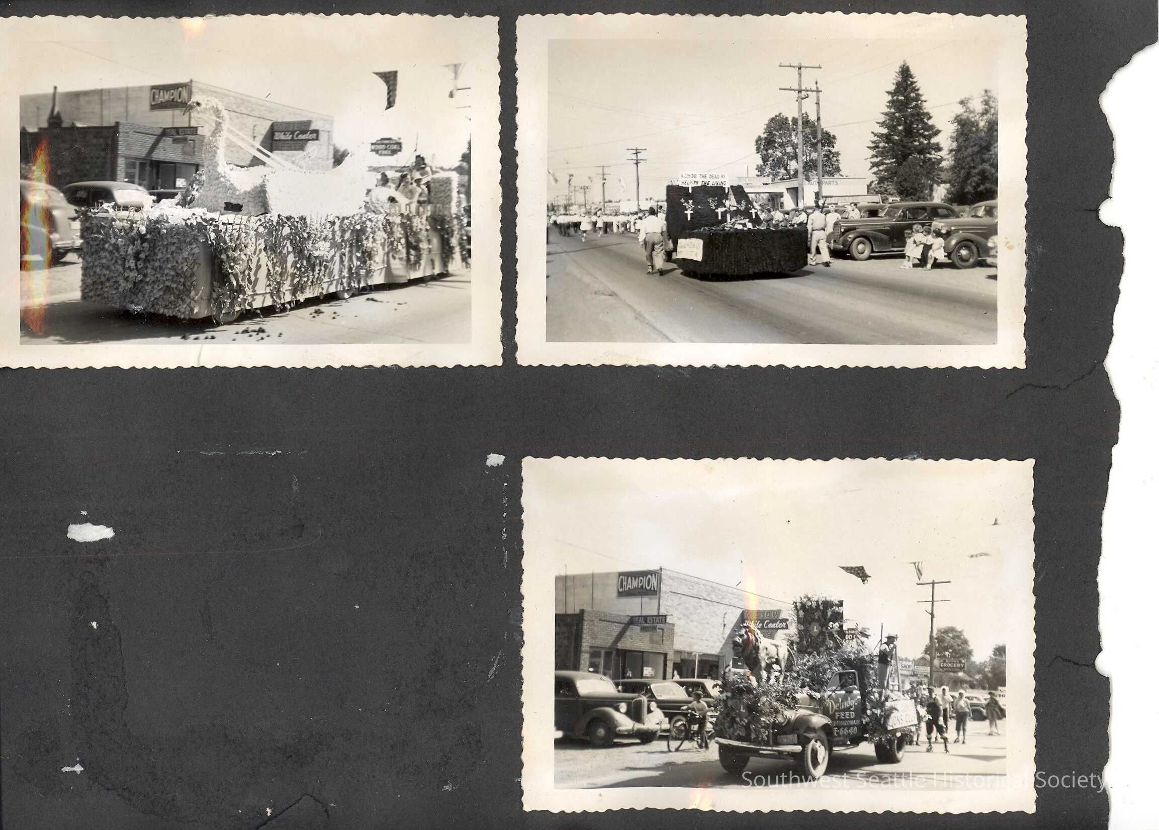 b) 3 floats in the hi-Yu parade - White Center Motor Part, Champion Real Estate, Delridge Feed, Ruths Grocery (business visible in photos), little girl and grandma? sitting at outside table, woman standing in the woods, little girl and grandma on a boat, little girl in field, man standing in stream, little girl next to house