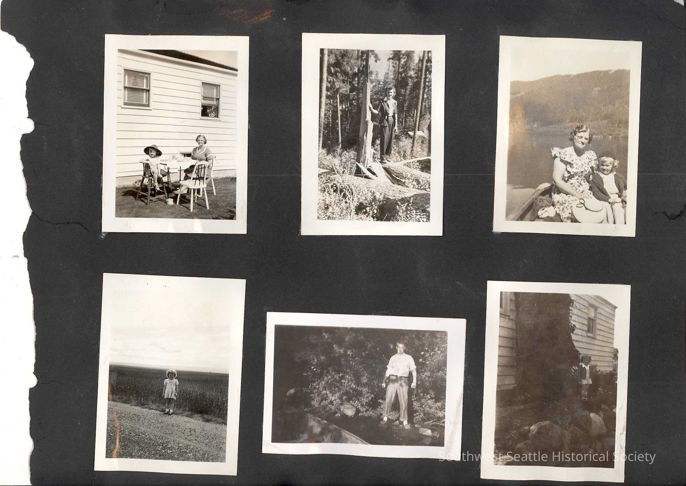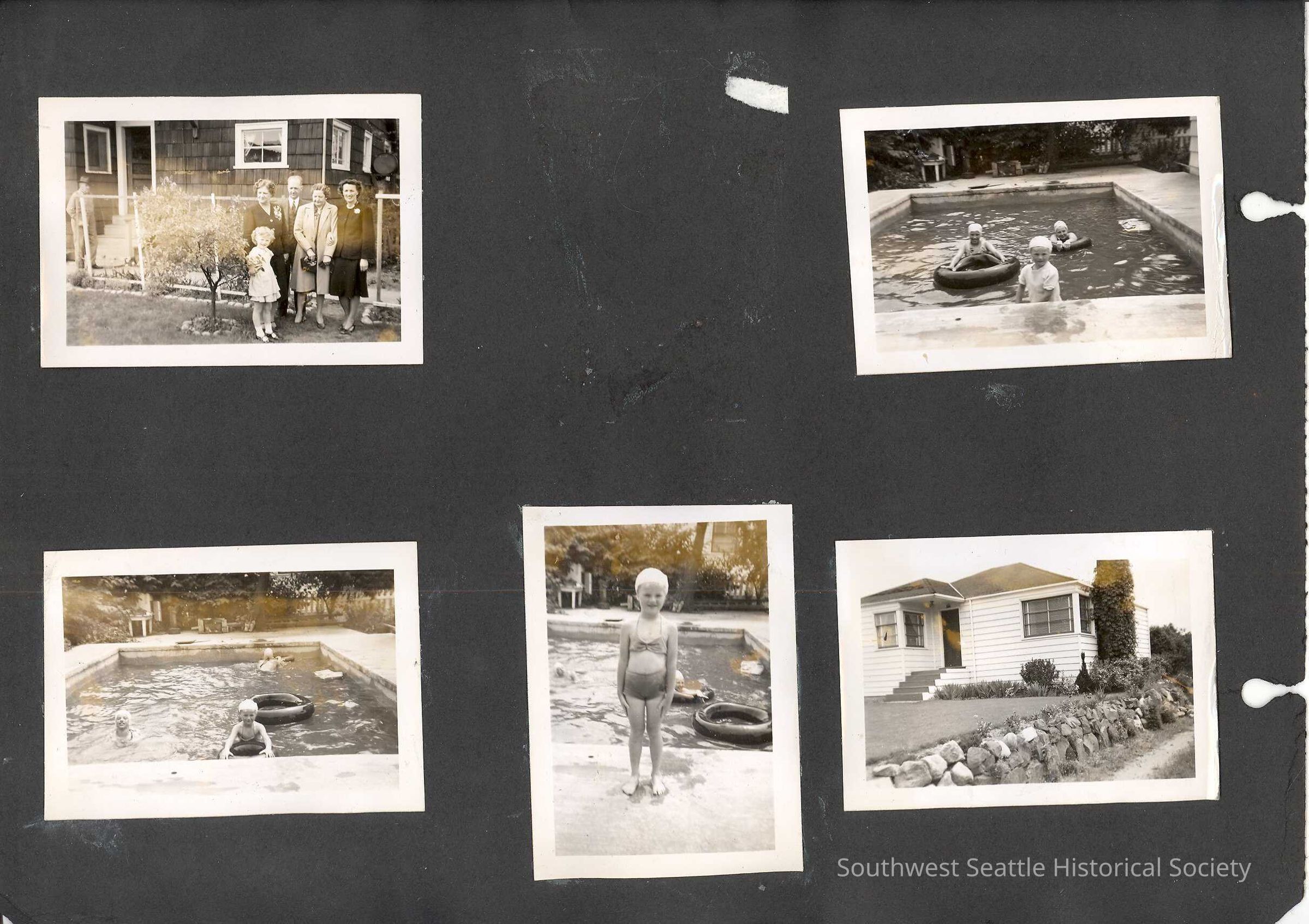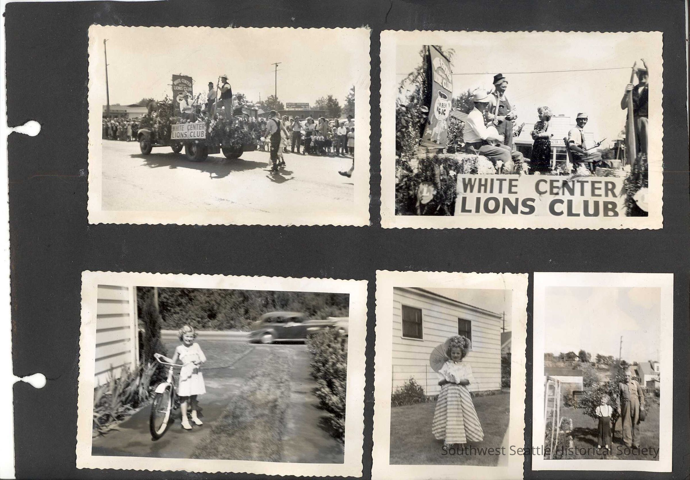 a) family standing in front of house, children swimming in pool, home photo, White Center Lions Club parade float (hula dancer is the same little girl in rest of these photos), little girl with bicycle, little girl in costume, old man and little boy in yard