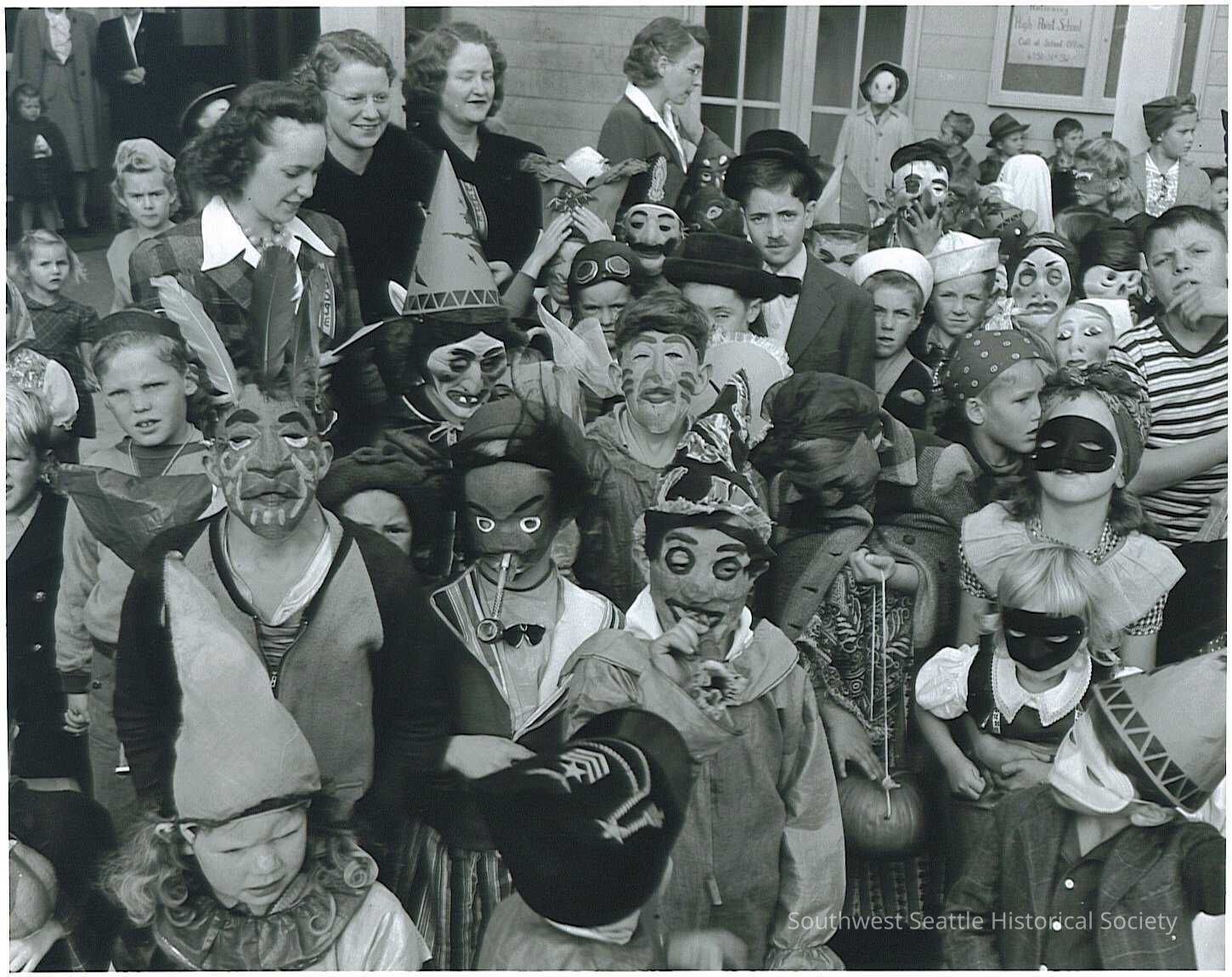 The High Point housing project was built to house workers and their families who came to West Seattle during World War II, when the area's shipyards and airplane factories provided many new jobs. The project's 1,300 apartments were ready beginning in April 1942. During the first year, kindergarten was held at the community hall and later a 12-room High Point School opened. This photo shows children at a party, probably being held in the community hall.