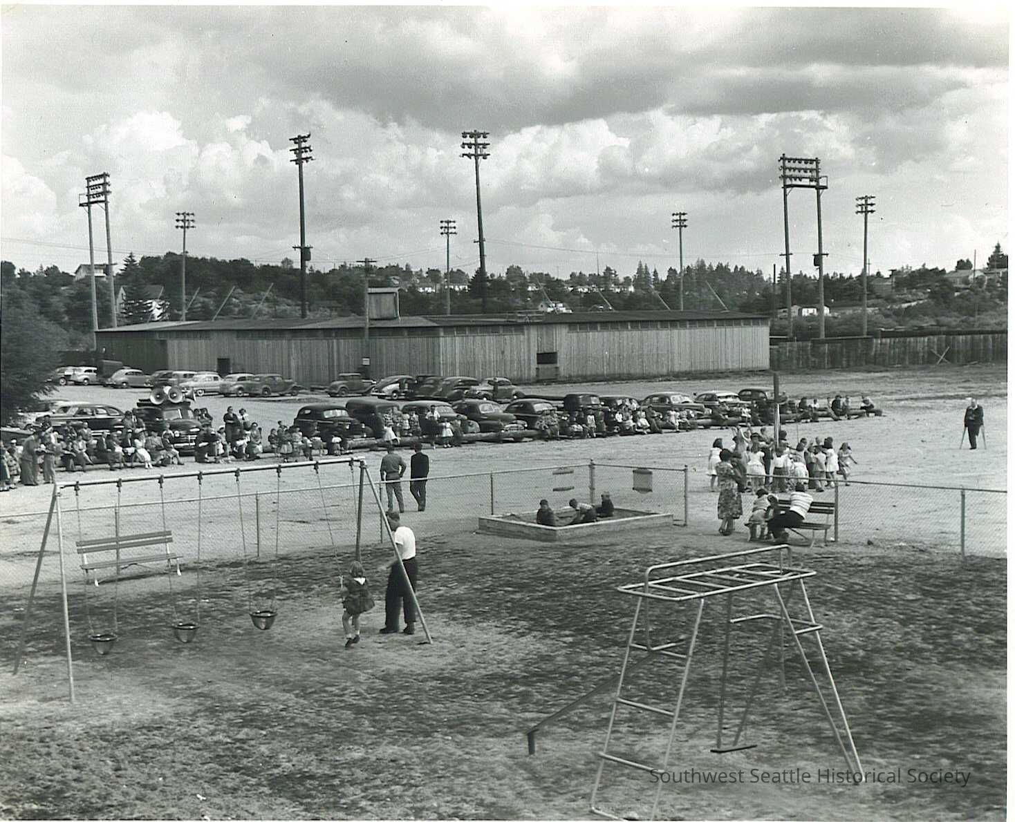 lableled "Dedication of the new children's area - White Center Playfield - donated by the WC Lions Club - 5/22/49"