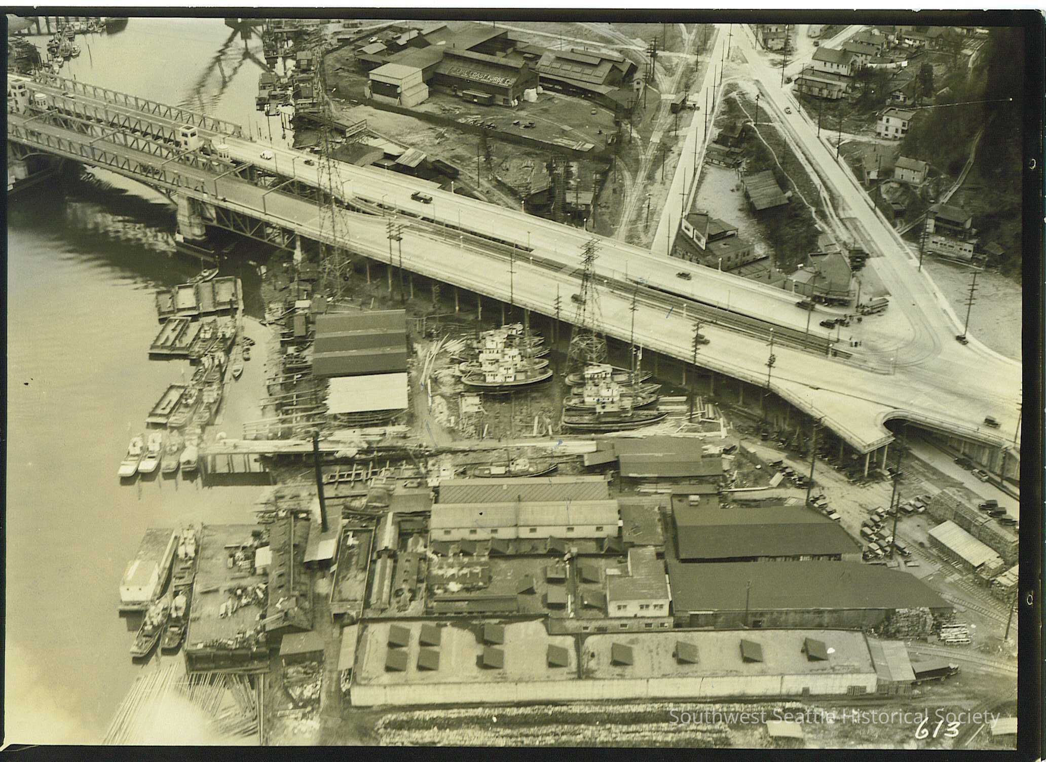 Scan of BW photo Aerial of the Duwamish River Taken on March 27, 1935 Sawmill and moorage visible next to bridge