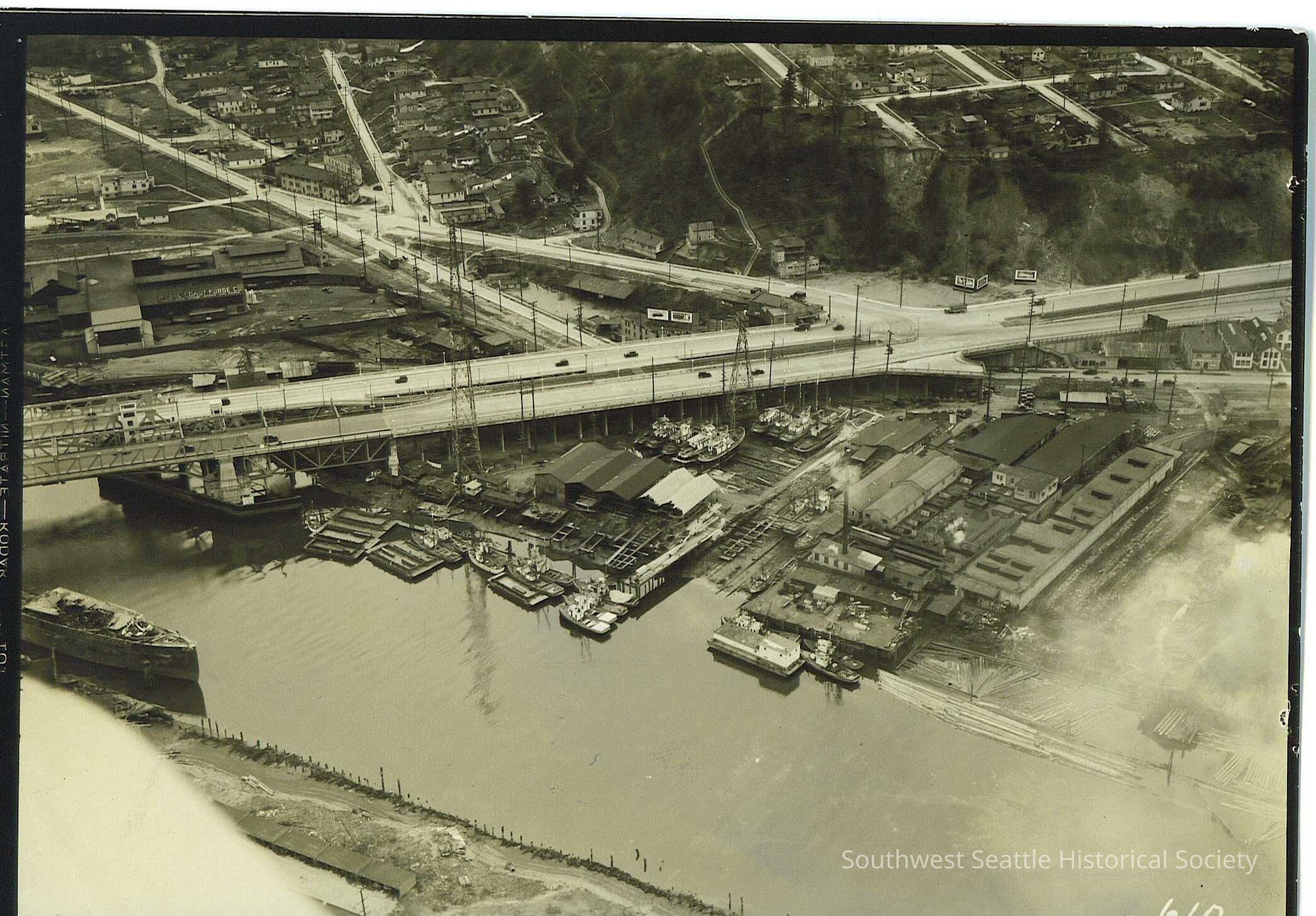 Scan of BW photo Aerial of Duwamish River/Riverside Old West Seattle Bridge, moorage, Hotel West taken on March 27, 1935