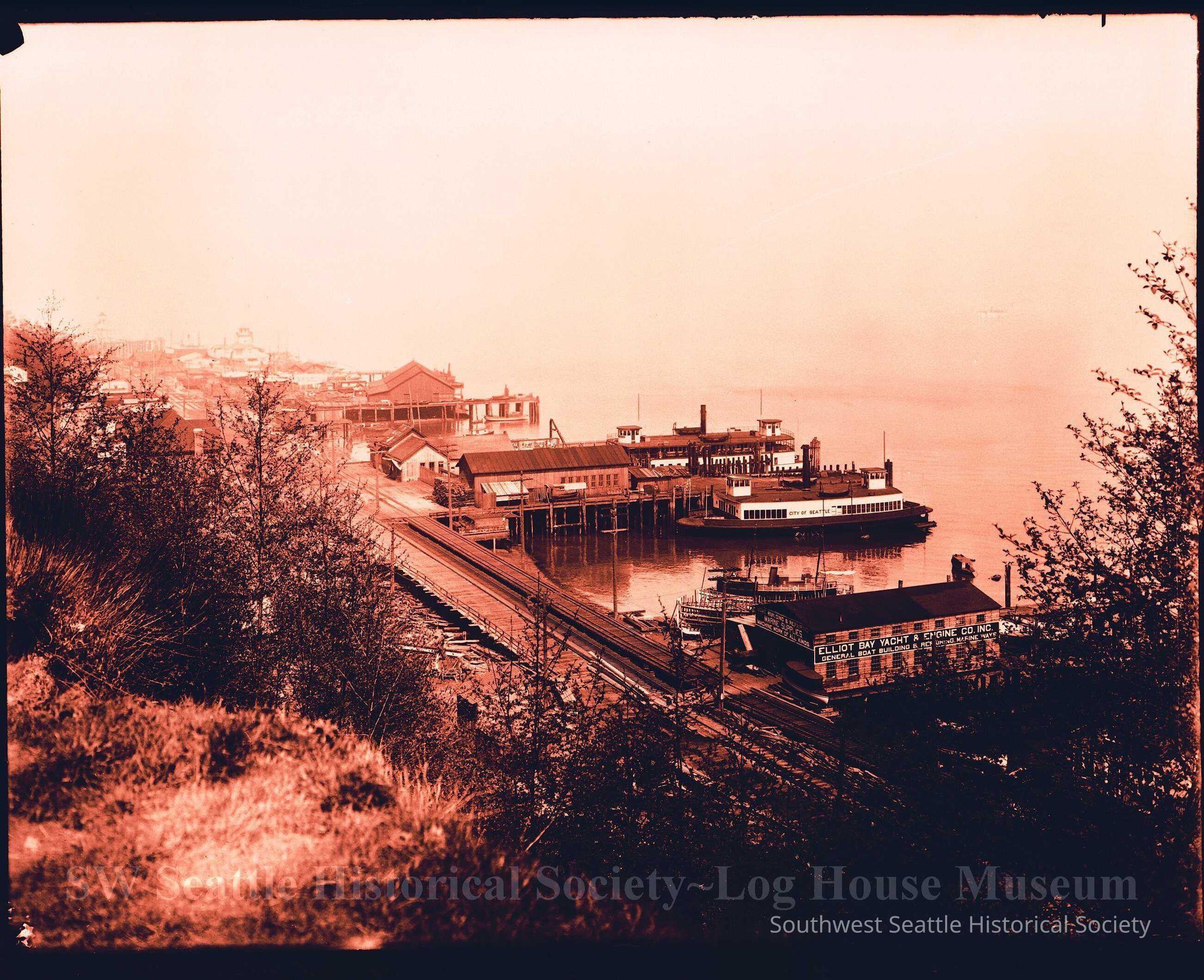 Black and white photo of Harbor Avenue around 1907-1910, facing NW towards Duwamish Head. Shows Elliot Bay Yacht and Engine Co., the West Seattle Ferry Dock and street car tracks going past 1st Yacht Club and King and Winge shipyard. Unusual since both the City of Seattle and the West Seattle ferry are docked.