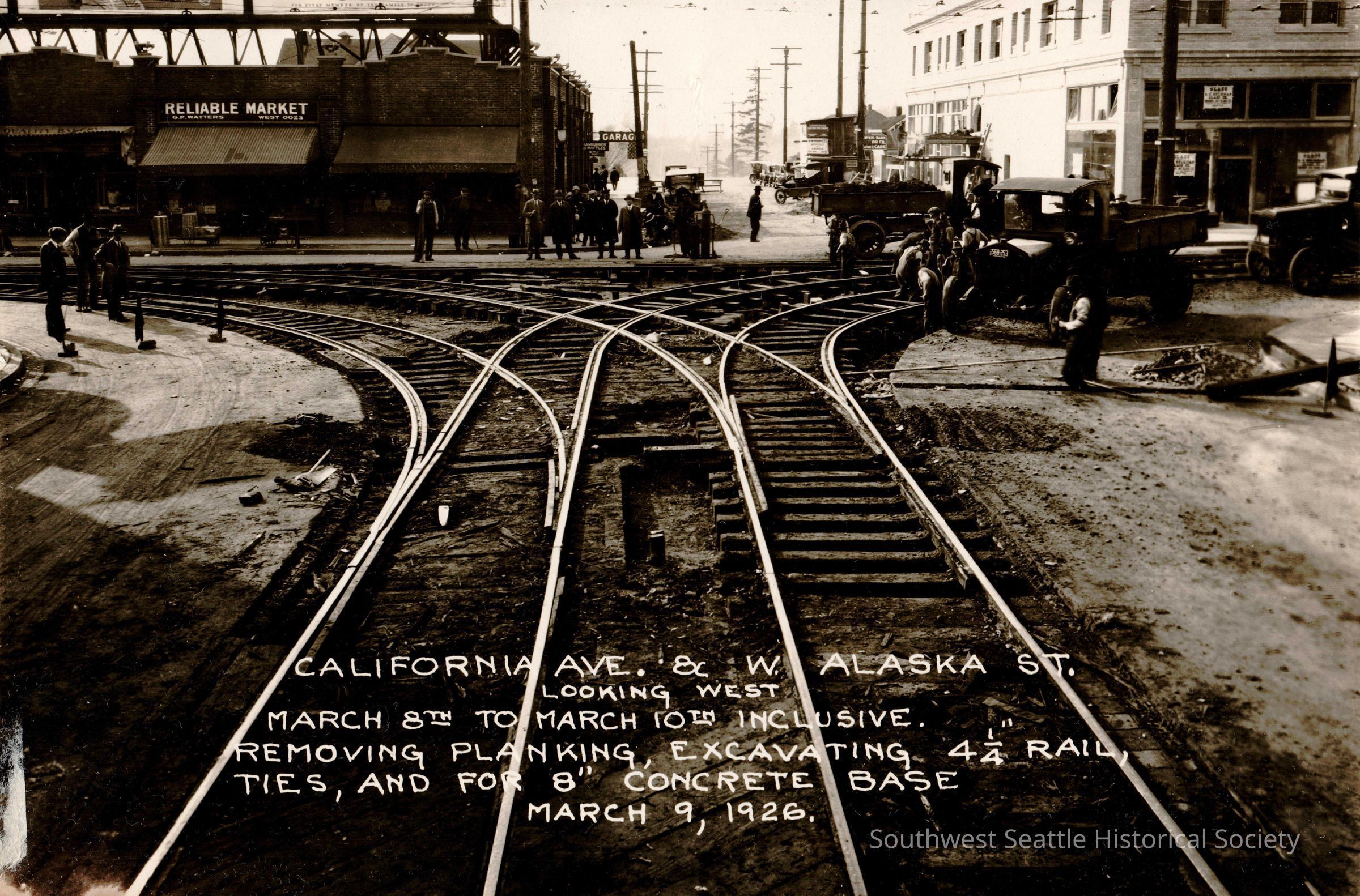 WS Junction (Alaska and California) facing west with track removal of 1926. California Ave and West Alaska Street looking west March 8 - 10, 1926.Inscription/Signature/Marks