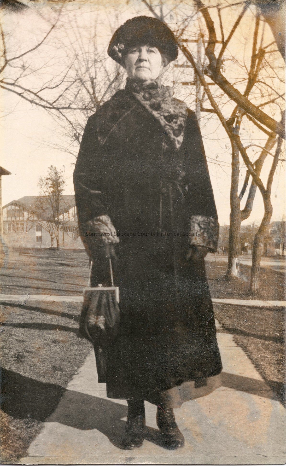 Portrait of Eleanor Hendricks Sperry standing on 4th street west of F. In the background is the 1912 Congregational Church.