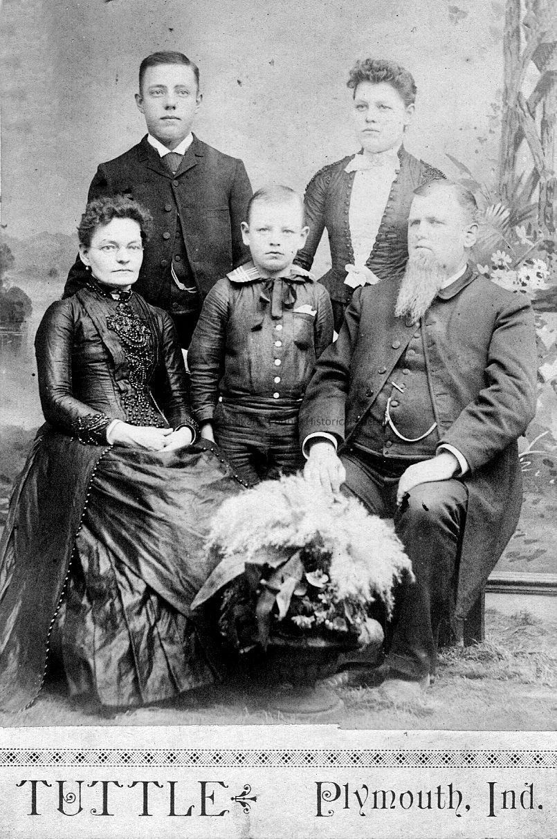 Cabinet card photograph of family of 5 people,unidentified but likely a relative of the Henry or Wilson families. From the Tuttle studio of Plymouth Ind.