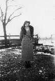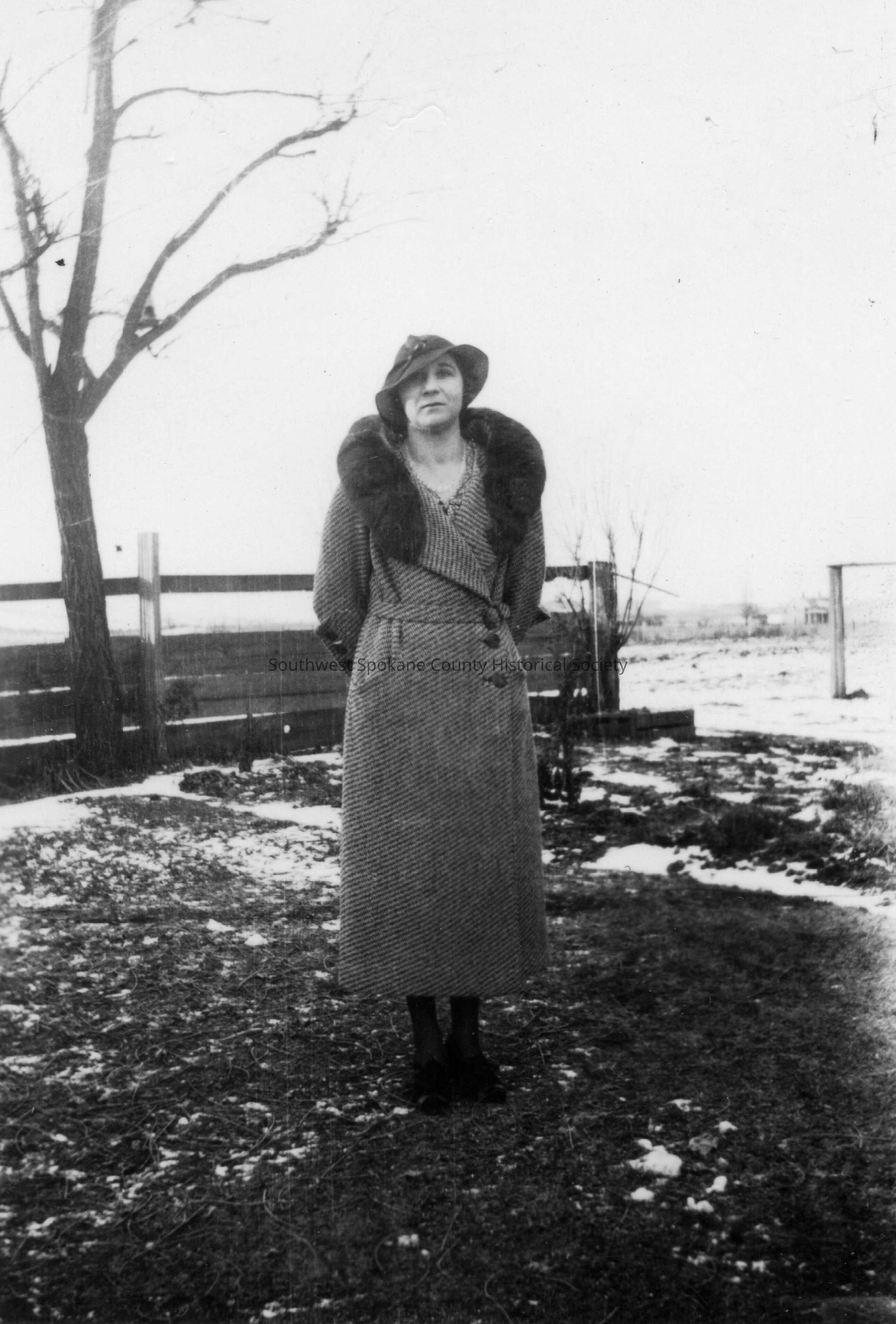 Black and white snapshot photo of Hilda Wittenbach standing outside in witner.
