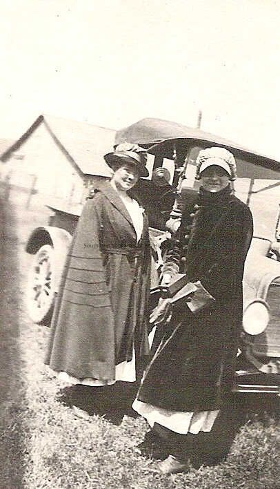 Black & white snapshot photograph of Myrtle Marsh and an unidentified woman with a car.