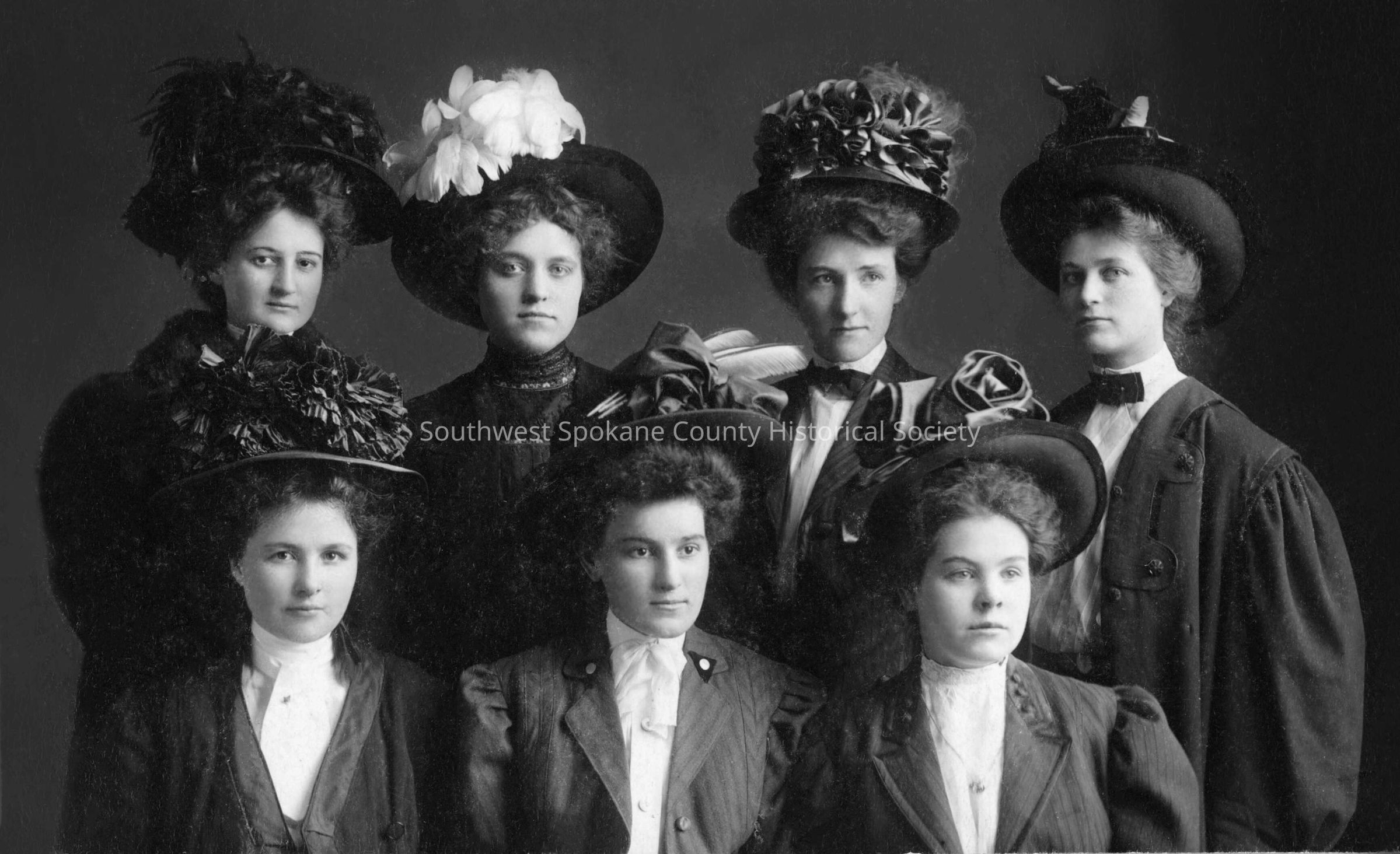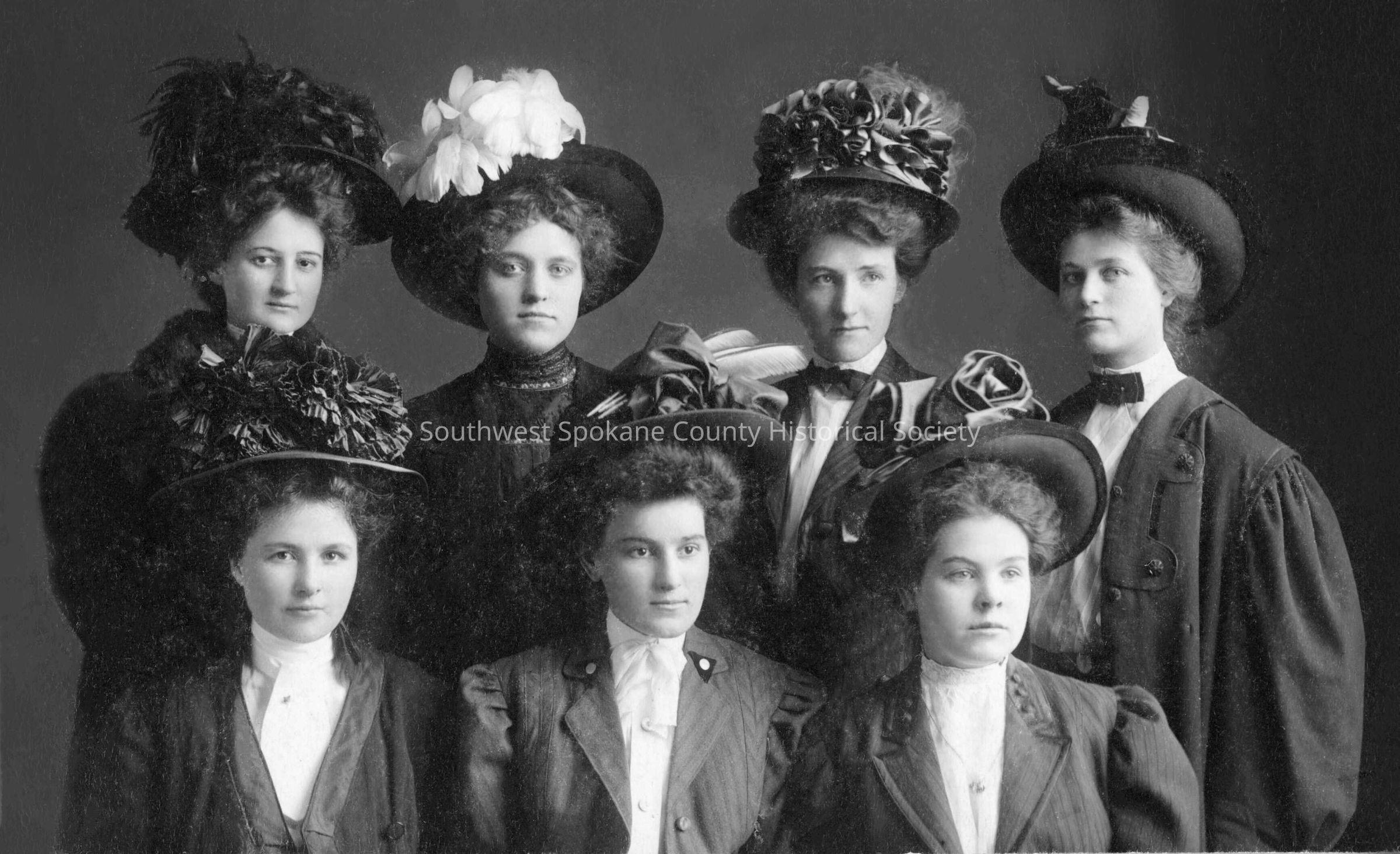 Scanned image of a group of women showing the hat fashions of the early 1900s. Included are Ethel Adams Ramsey (second row, second from left), Mayme Bradley Adams (second row, third from left), Ella Adams Witt (second row, far right).