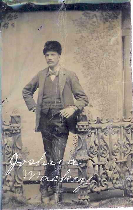 Small black & white tintype of Joshua Mackey standing In elaborate wood cut out and carved wood frame with 2 oval spaces for photos. When Pastor James Egbert came in 1911, fundraising began to construct a new brick church. The old church building was moved to 714 6th Street, where extensively remodeled into the King apartments, that still stand today. Master builder, S.V. Mackey and a large workforce erected the new church building. After its completion it was described as "a place of beauty for reverent worship." Cheney Free Press 16 September 1914.