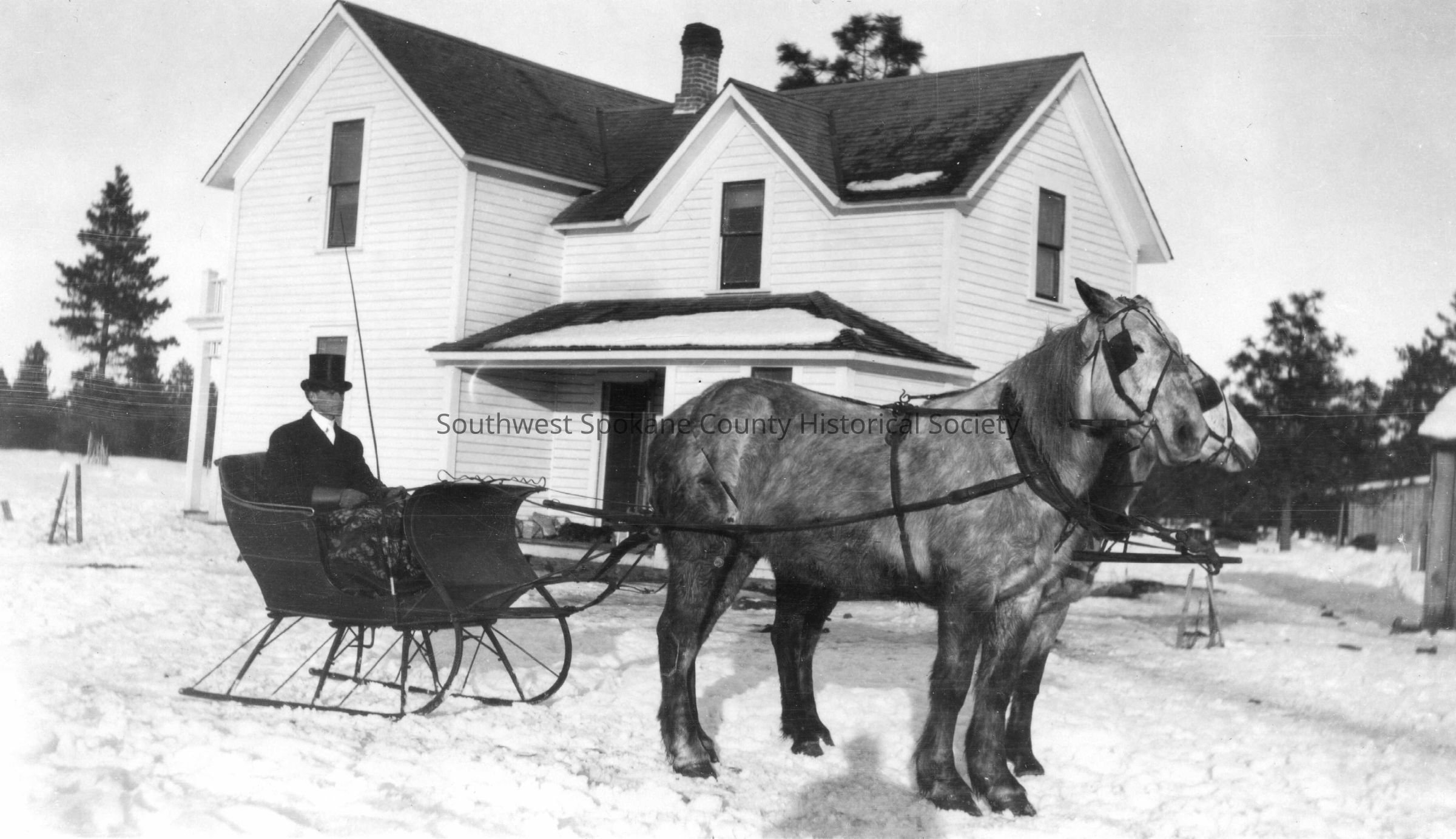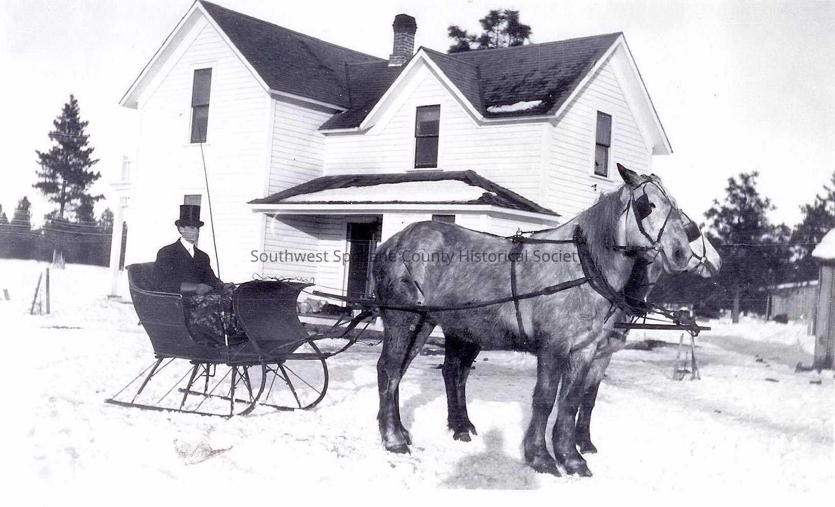Black & white photo of Fred Campbell circa 1900 in cutter rig pulled by 2 horses. Location unknown, perhaps the family farm? Original is in "Pioneer Families - Fred Campbell" #2303