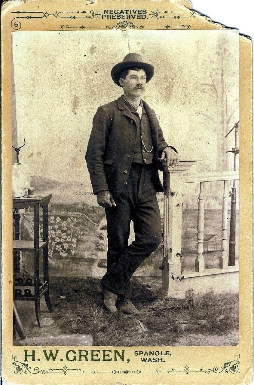 Cabinet card full portrait identified as Phillip Mashburn taken at Spangle Washington 1892. Printed on front: H.W. Green, Spangle, Wash. 6.5 x 4.25