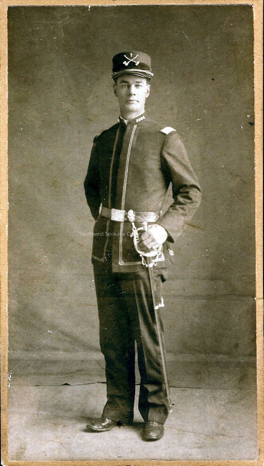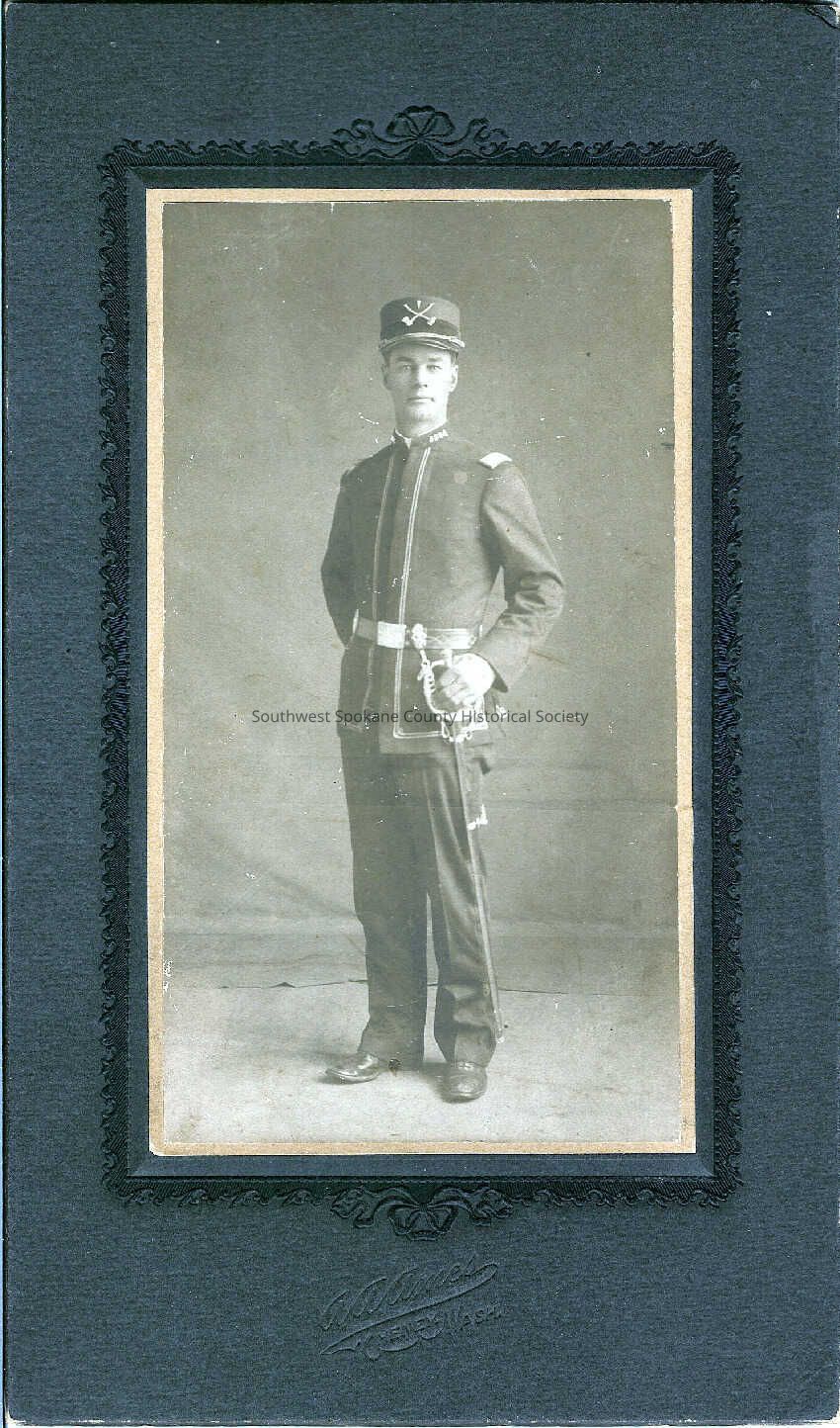 Black & white photo of Alva Briner, full portrait, undated. Fire Department uniform. Taken by A.A. Ames Studio. Mr. Ames operated in Cheney from about 1903 to around 1910. 5.5 x 3.