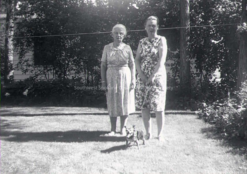 Circa 1964 Black & white snap shot photo of Thordis Pratum Johnson with an unknown woman in the yard of her house on North 4th Street in Cheney.