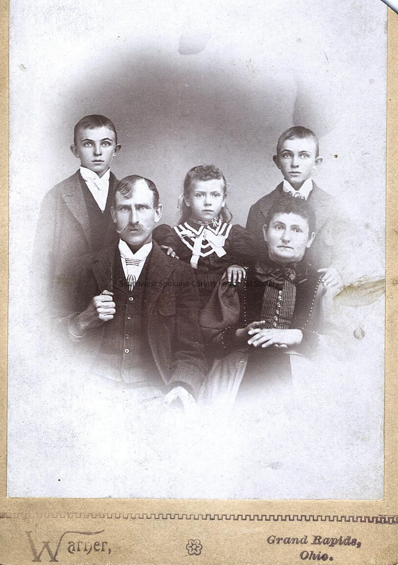 Cabinet card photograph of family of seated man & woman with children (2 boys and a girl) standing behind. Warner studio of Grand Rapids Ohio. People unidentified but likely a relative of the Henry or Wilson families.