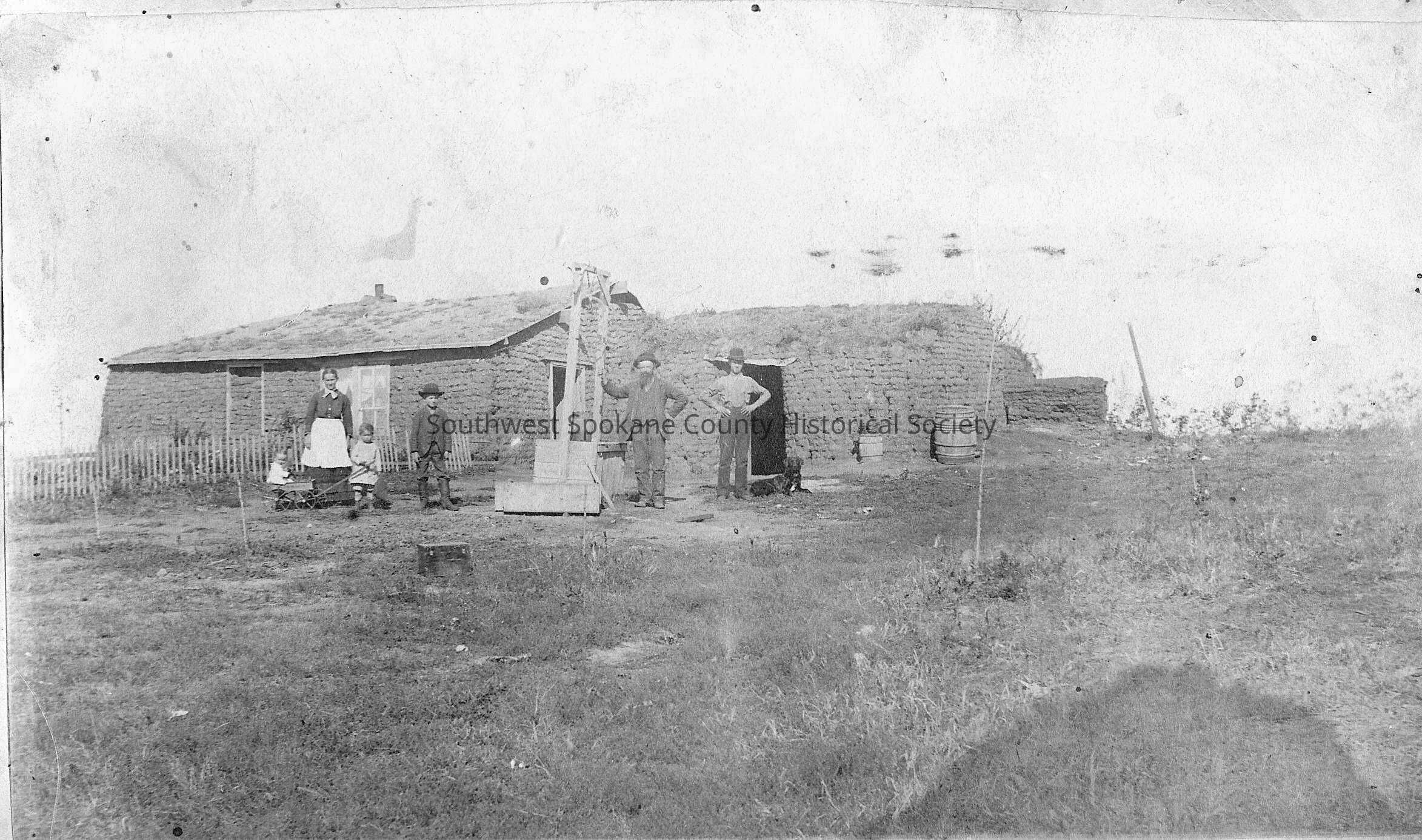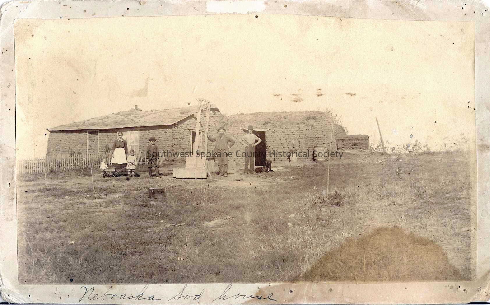 Black & white photo of family standing outside a Nebraska sod house. Date and location unknown, mounted of white cardstock.Acquisition
