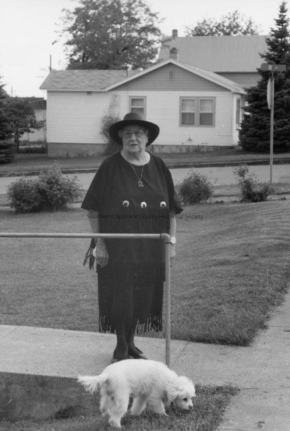 Mrs. Lillian Fish with her dog on the front walk of her home at 803 2nd Street near B Street. In the background is 723 2nd Street.Acquisition