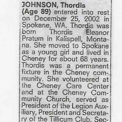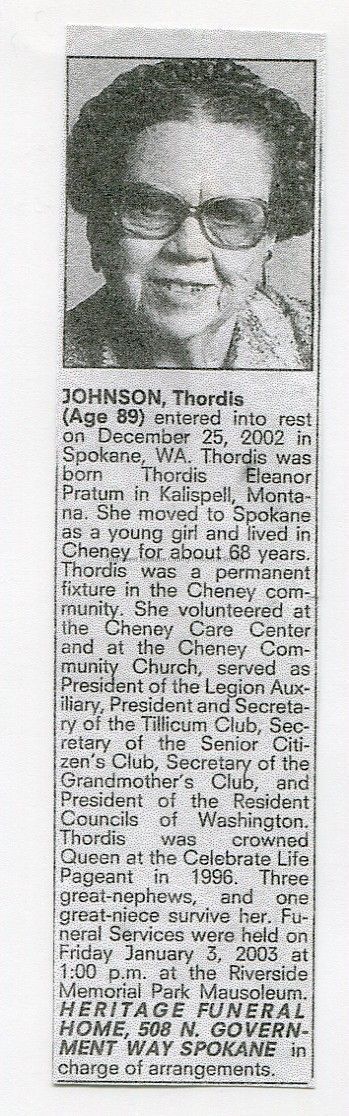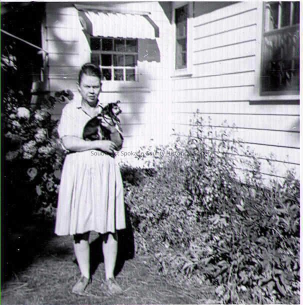 October 1964 Black & white snap shot photo of Thordis Pratum Johnson in the yard of her house on North 4th Street in Cheney.