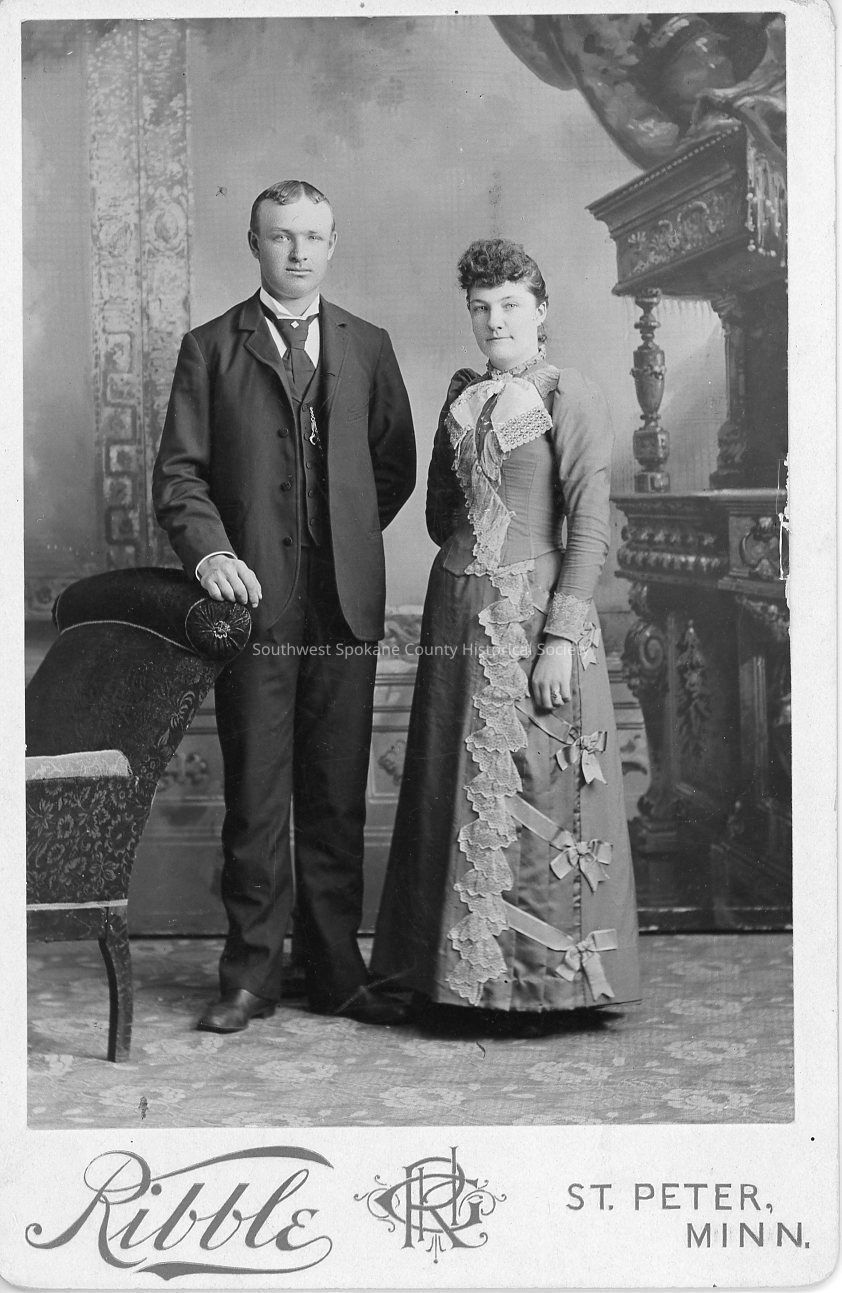 Unidentified man standing with hand on chair and woman standing with arm behind back; Photographer, Ribble of St. Peter, Minnesota