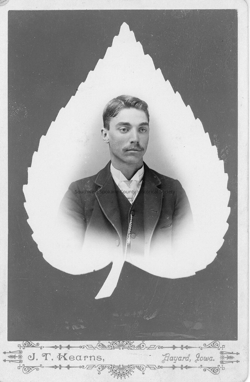 Photo of unidentified man with mustache framed with leaf motiff; Photographer, J. T. Kearns, Bayard, Iowa