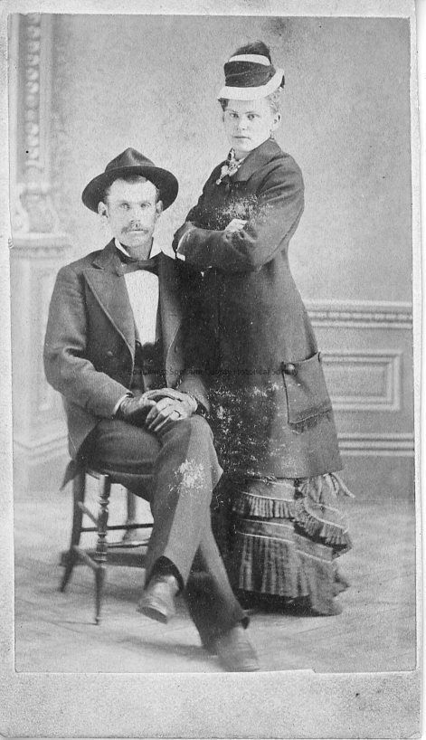 Photo of unidentified man wearing hat and gloves sitting in chair and young woman wearing hat with feather and arms crossed