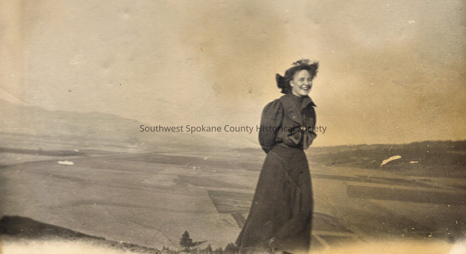 An unidentified laughing woman. She is standing at the top of a hill with valley farmland spread out behind her.