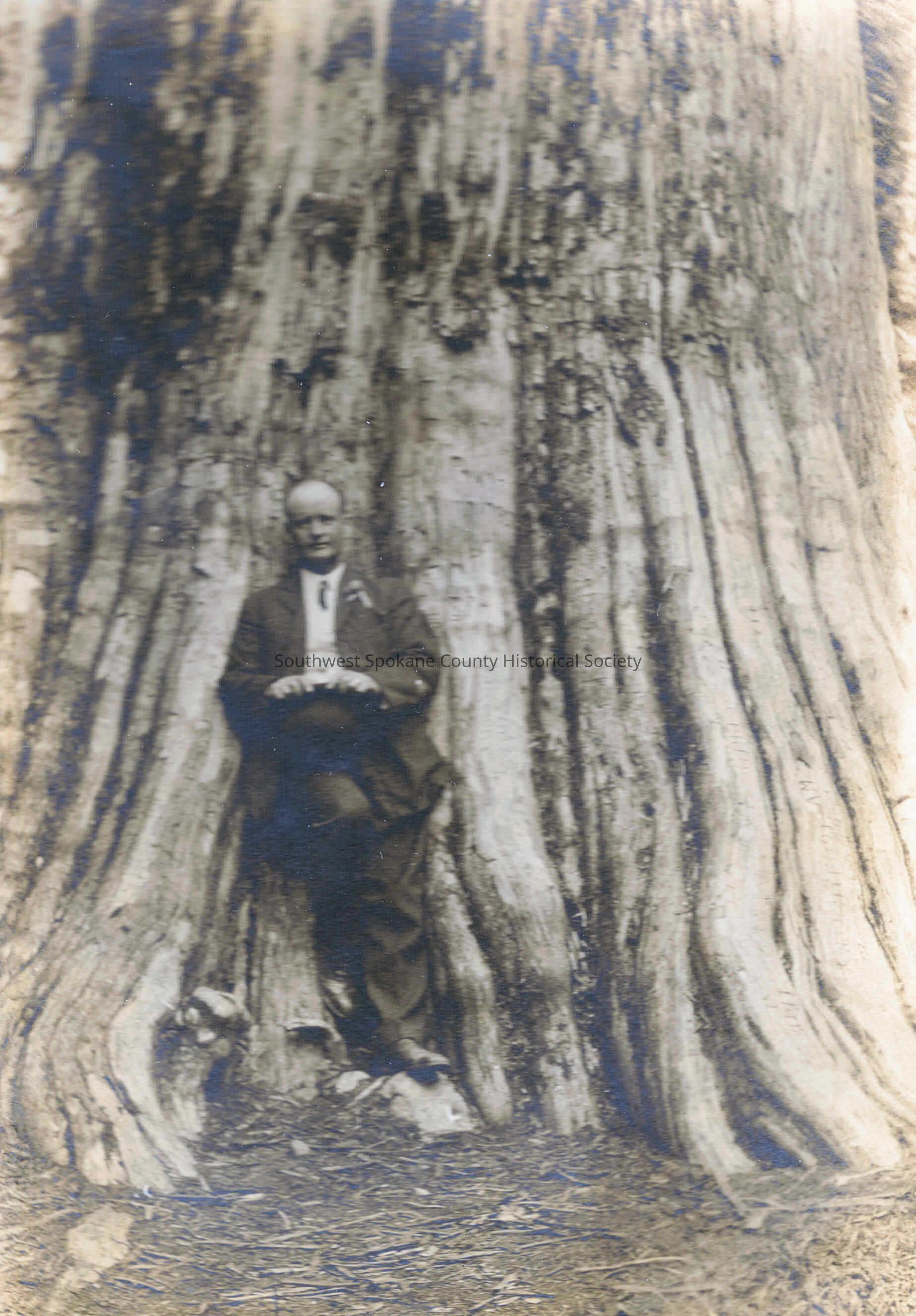 Unidentified man in a suit holding his hat while learning against the trunk of an immense tree.Acquisition