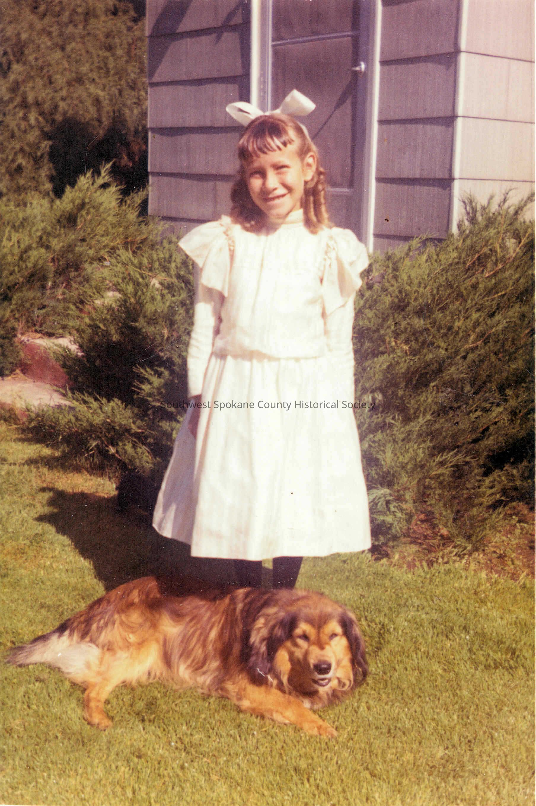 1961 color photograph of Anita Loreen Falk at eight years old wearing a dress of her Great Aunt Eva Harris which was made in 1898. Gertrude's granddaughter. 3.5” x 5”Acquisition