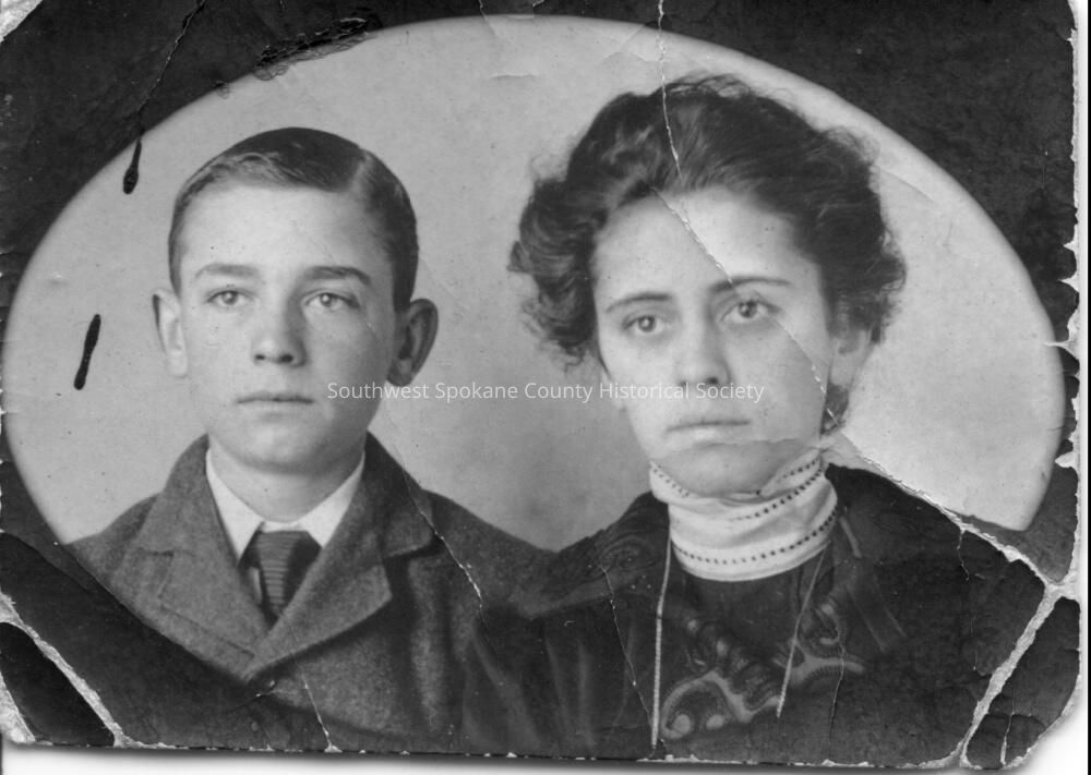 Black & white portrait of Cora Johnson and an unidentified brother, children of Alden & Elizabeth Myers Johnson.