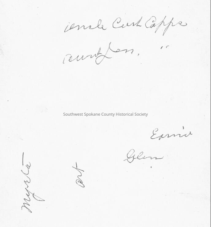 Written on back of photo: Uncle Carl Cappe(Caffe?), Aunt Jen, Earnie, Glen, Art, Myrtle.Acquisition