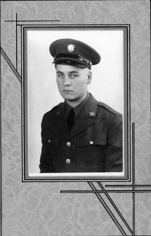 Black and white portrait of a young soldier, with Franklin written on the front. The photograph was part of a group that came from the Herman Fitzner family. However, we do not have his last name. The folder is stamped Fireside Foto Studio, Rantoul, Illinois.Acquisition